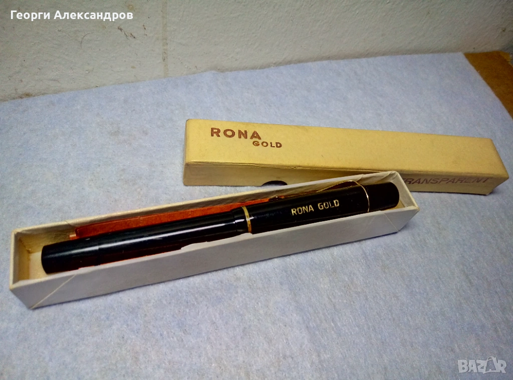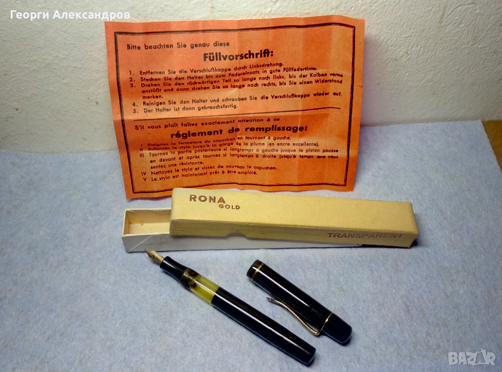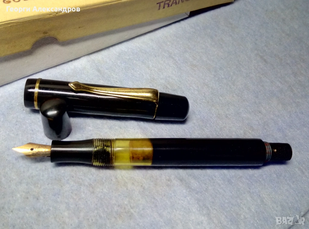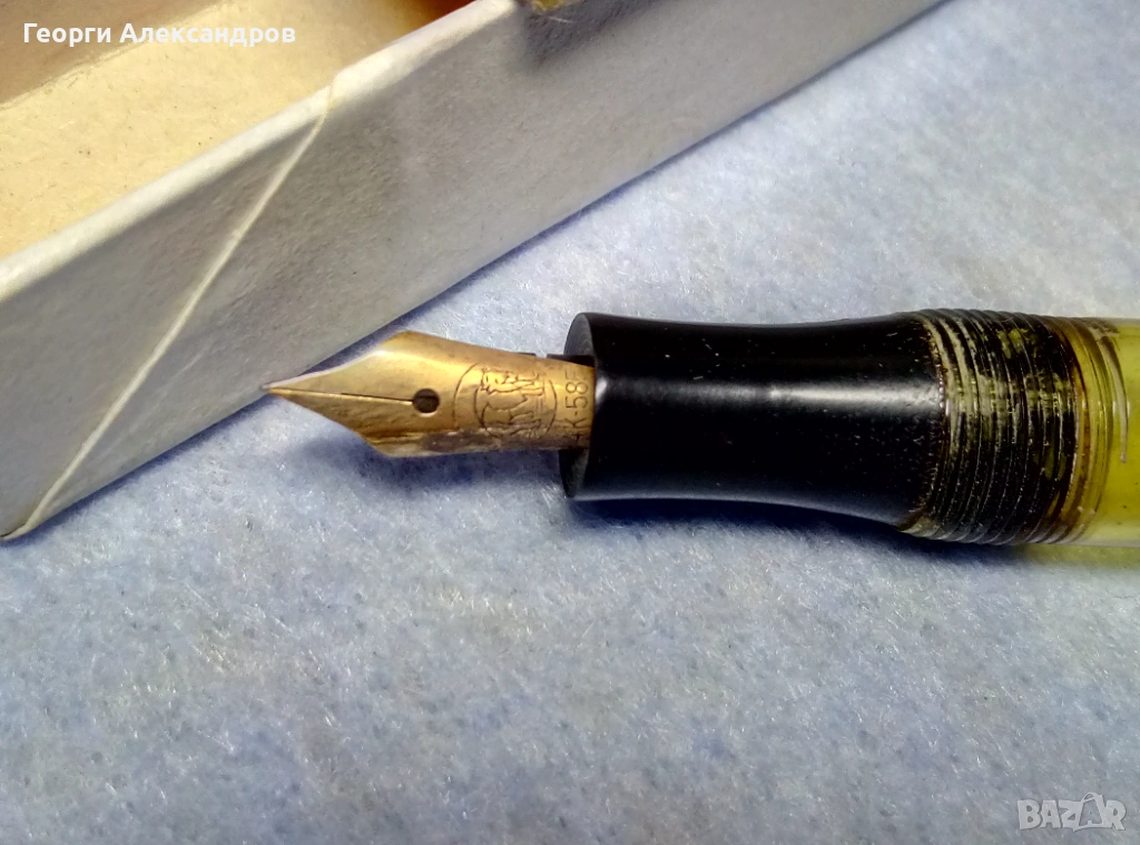 Писалката е в много добро колекционерско състояние, функционираща, буталото работи. С оригиналната й маркова кутийка и с инструкции. Златният й писец също е оригиналният и е с маркировки за 14-каратово масивно злато /известно е, че тежат около 0,45 до 0,6 грама!!!/. Бакелитеният корпус и капак са здрави и запазени. СИМВОЛИЧНА цена! Изпращам само по Еконт с Преглед Тест и отстъпка-транспорт.