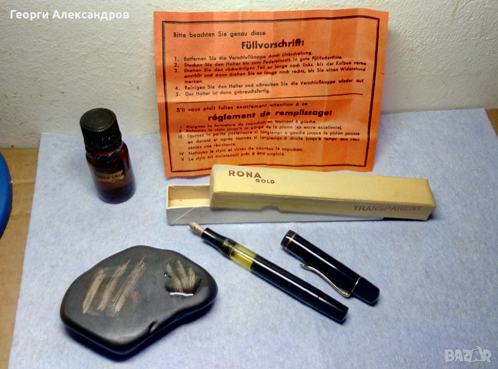 Писалката е в много добро колекционерско състояние, функционираща, буталото работи. С оригиналната й маркова кутийка и с инструкции. Златният й писец също е оригиналният и е с маркировки за 14-каратово масивно злато / известно е, че тежат между минимум 0,40 - 0,45 до 0,60 грама - тоест САМО ПЕРОТО е с РЕАЛНА ПАЗАРНА СТОЙНОСТ ОКОЛО поне 30€ и то в Заложна къща, по минимална изкупна оценка като за материал!!!/. На ПОСЛЕДНИТЕ 2 СНИМКИ се вижда пробата с киселината-пробер върху Лидийски камък как съм го ТЕСТВАЛ - натъркано е внимателно ръбчето на перото 3 пъти върху камъка и е капнато от киселината - ПРОБАТА ДЪРЖИ КАТЕГОРИЧНО за ЗЛАТО проба 585. Бакелитеният корпус и капак са здрави и запазени. СИМВОЛИЧНА цена! Изпращам само по Еконт с Преглед Тест и отстъпка-транспорт. ИМАМ и СРЕБЪРНИ БИЖУТА, КОЛЕКЦИОНЕРСКИ и ОКАЗИОННИ НЕЩА в ОБЯВИТЕ си...!