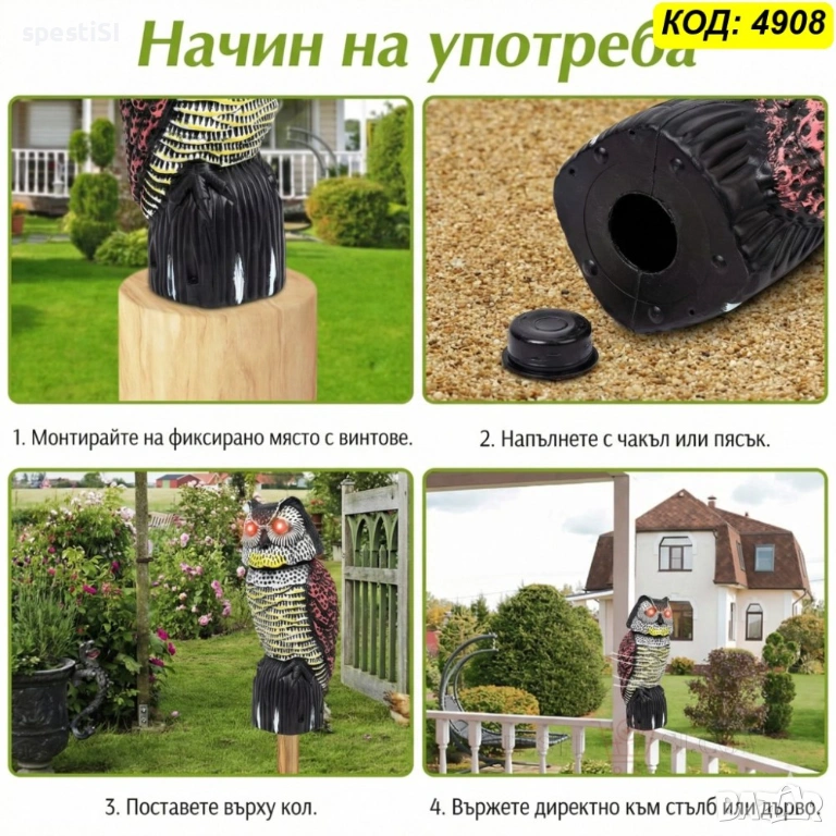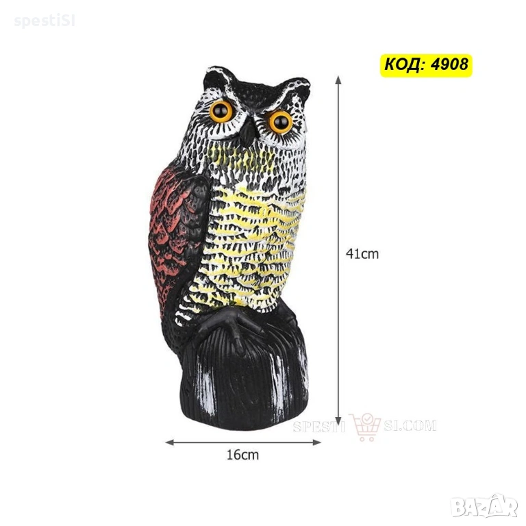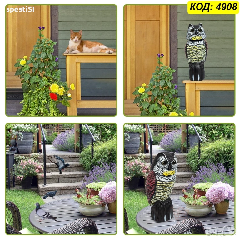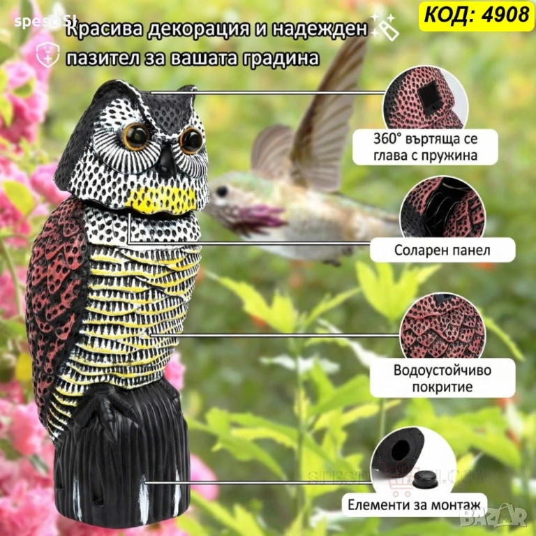 Основното предимство на тази фигура е двойният механизъм на действие. Главата на бухала е монтирана на пружина и се върти на 360 градуса при пориви на вятъра, създавайки илюзия за жив наблюдател. Допълнително, вграденият соларен панел зарежда очите, които светят в червено, за да осигурят защита и при по-слаба светлина или здрач.