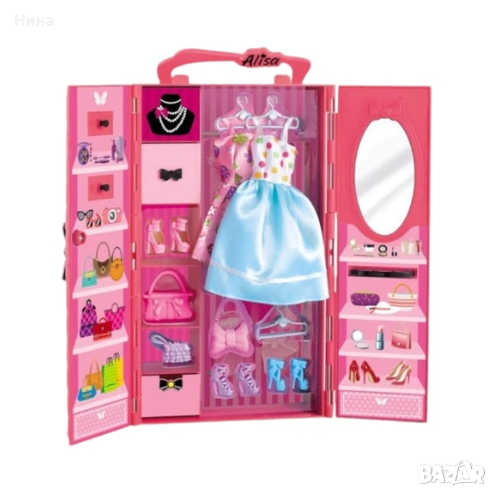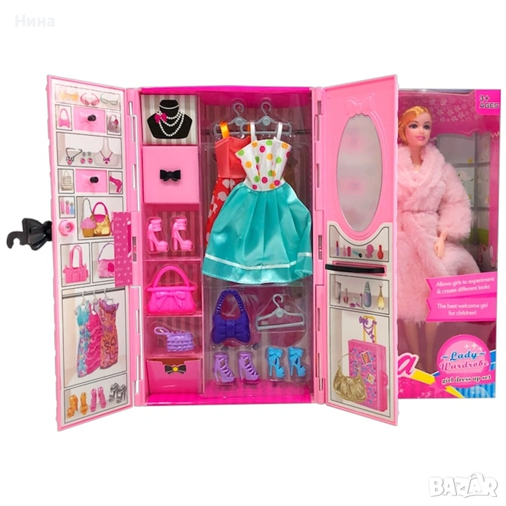- гардероб с удобно разпределение - място за куклата, място за закачване на роклите, шкафчета за обувките и чантите