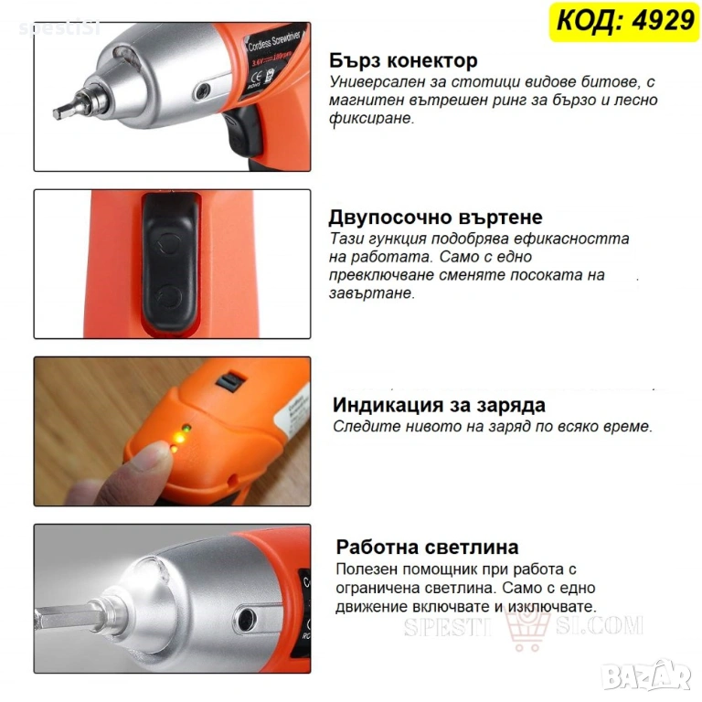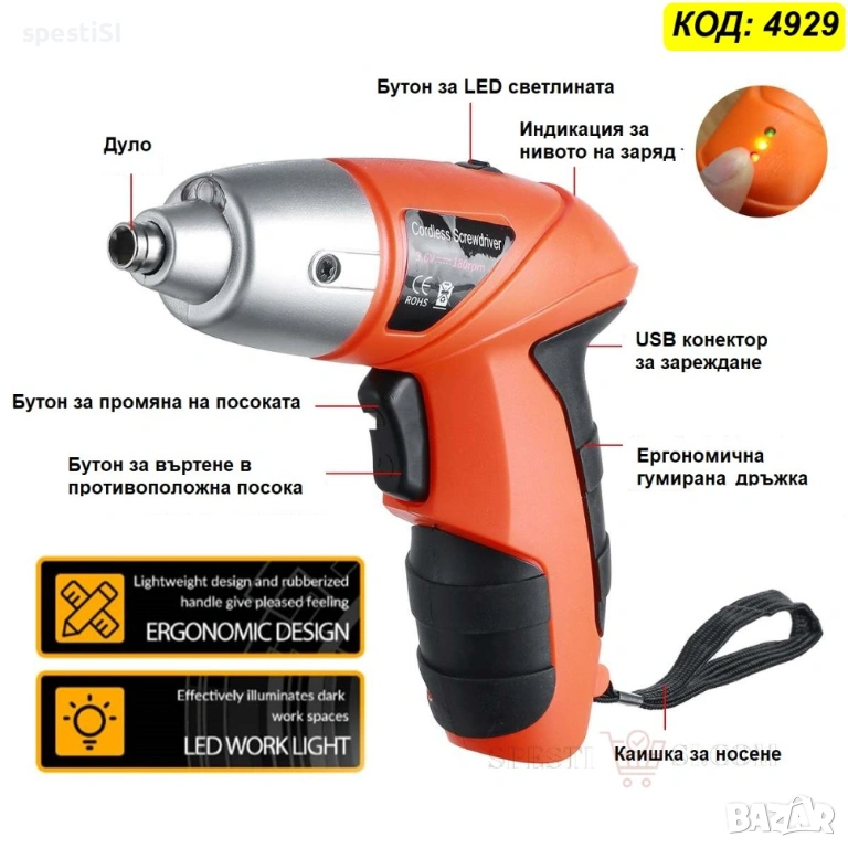 Екстри: LED работна лампа, индикатор за батерия, реверс (ляво/дясно въртене)