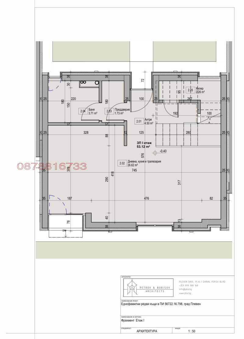 -първи етаж: антре, килер, предверие, баня с тоалетна, дневна с кухня и трапезария - 53,12кв/м.