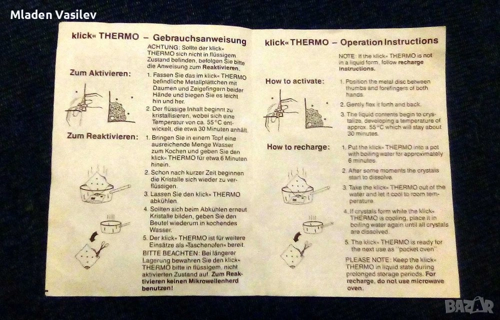Компактен химичен туристически отоплител. Представлява гел в ПВЦ пликче, в което плува метална пластина. За да се активира се огъва пластинката, което стартира процес на кристализация и гелът се втвърдява като повишава температурата си до 55 градуса. След употреба се поставя в съд с вряща вода, при което се връща в течно състояние. Процесът може да се повтаря безкрайно. Идеален за къмпинг, риболов и т.н.