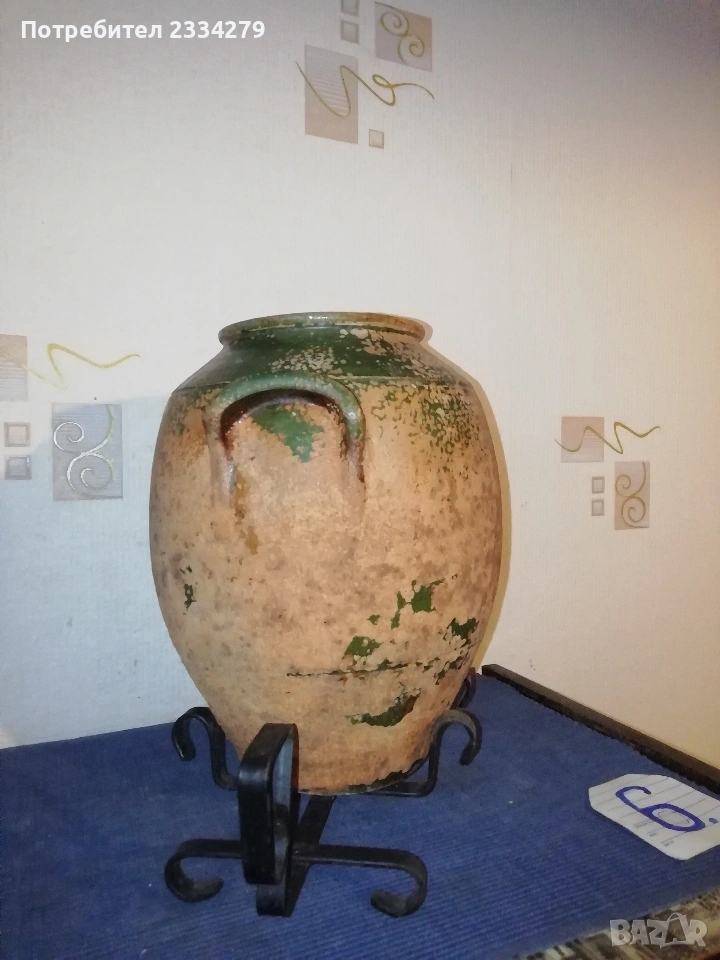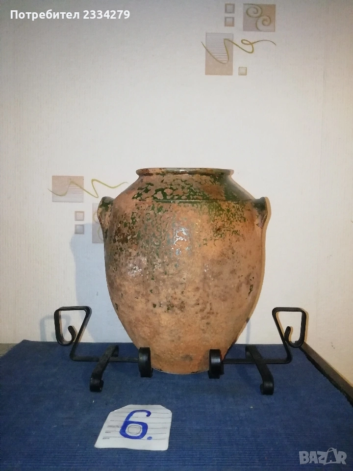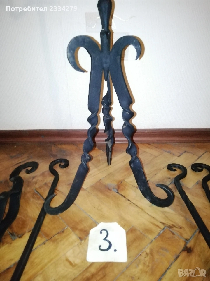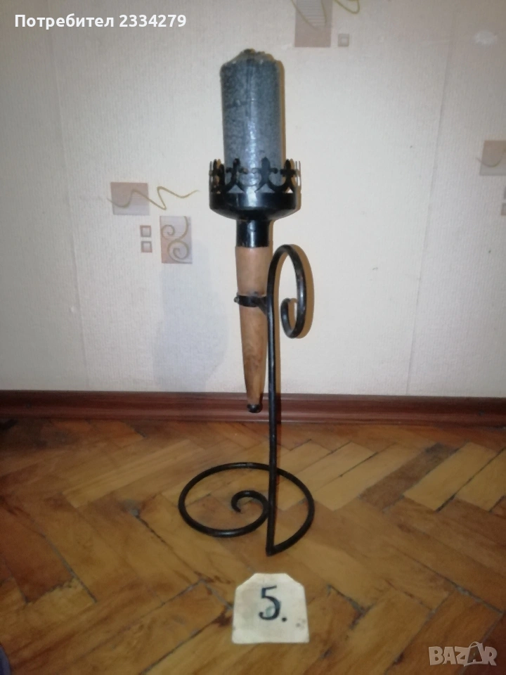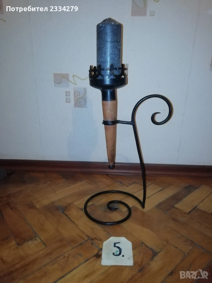 Стари декорация за дом, заведение, офис, вила. Ръчни авторски изработки. N:1 стар месингов свещник, може и пепелник, масивна изработка във флоренциански стил, целият орнаментиран, размери 57х27см., цена 25€.; N:2 свещник стара изработка от ковано желязо с размери 55х25см., цена 8€.; N:3 комплект от прибори за камина, ръчна изработка от ковано желязо, посукано с орнаменти, стойка с четири различни прибра, размер 87х33см., цена 40€.; N:4 амфора, керамична ваза ръчна авторска изработка с красиви различни орнаменти рисувани-за дълбани в глината, поставена на сгъваема метална стойка висока 75см.,размери на амфората 37х23см., цена 25€. комплектна; N:5 стар свещник модел факла, ръчна изработка от ковано желязо, дърво, красива рицарски модел отгоре с орнамент корона, размери 41х18см., цена 8€.; N:6 стара делва, 2гърне 100% автентичност с размери 27х23см.,поставена на стойка от ковано желязо, всичко е ръчно изработено, по делватаима следи от времето тъй като е много стара, няма пукнато и счупено, цена 17€. комплекта.