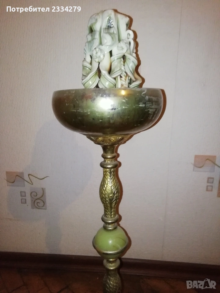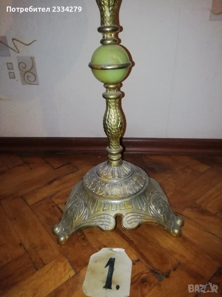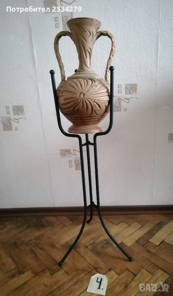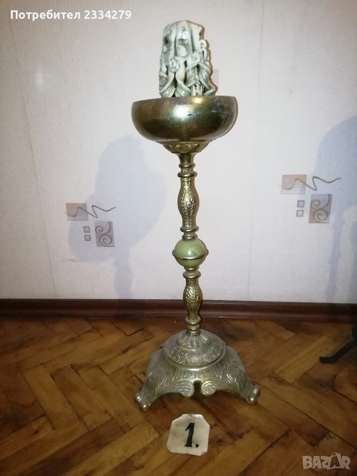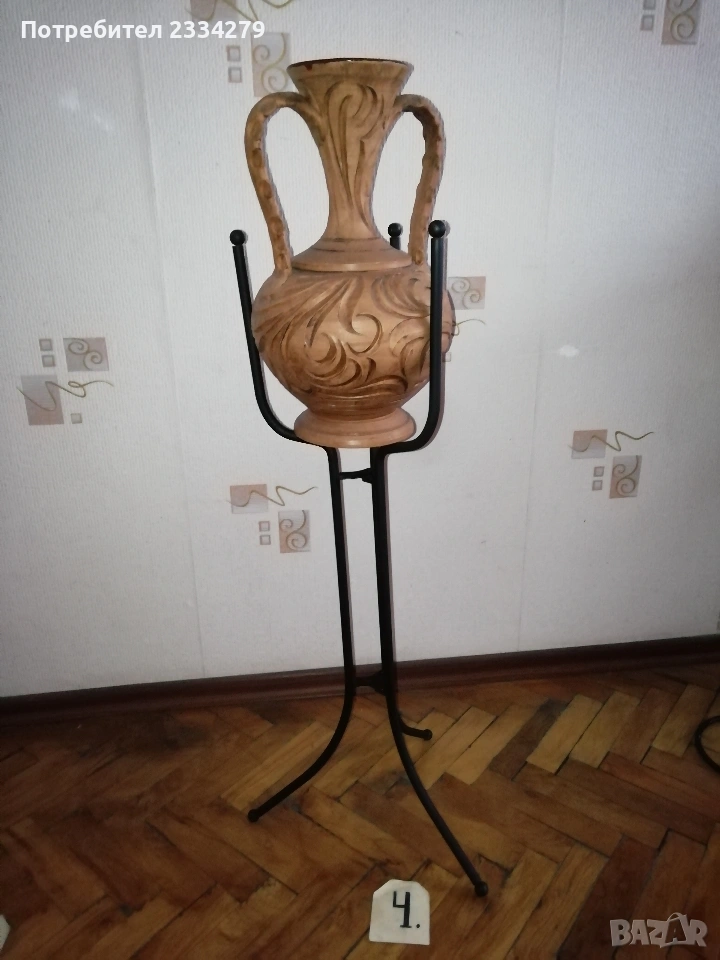 Стари декорация за дом, заведение, офис, вила. Ръчни авторски изработки. N:1 стар месингов свещник, може и пепелник, масивна изработка във флоренциански стил, целият орнаментиран, размери 57х27см., цена 25€.; N:2 свещник стара изработка от ковано желязо с размери 55х25см., цена 8€.; N:3 комплект от прибори за камина, ръчна изработка от ковано желязо, посукано с орнаменти, стойка с четири различни прибра, размер 87х33см., цена 40€.; N:4 амфора, керамична ваза ръчна авторска изработка с красиви различни орнаменти рисувани-за дълбани в глината, поставена на сгъваема метална стойка висока 75см.,размери на амфората 37х23см., цена 25€. комплектна; N:5 стар свещник модел факла, ръчна изработка от ковано желязо, дърво, красива рицарски модел отгоре с орнамент корона, размери 41х18см., цена 8€.; N:6 стара делва, 2гърне 100% автентичност с размери 27х23см.,поставена на стойка от ковано желязо, всичко е ръчно изработено, по делватаима следи от времето тъй като е много стара, няма пукнато и счупено, цена 17€. комплекта.