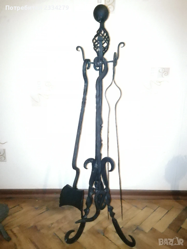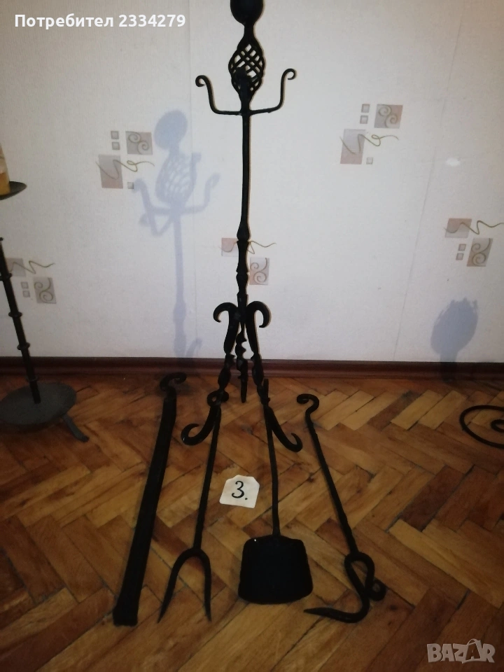 Стари прибори за камина, свещници, делви с поставки, всичко ковано желязо.
