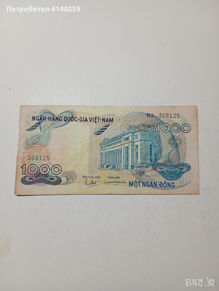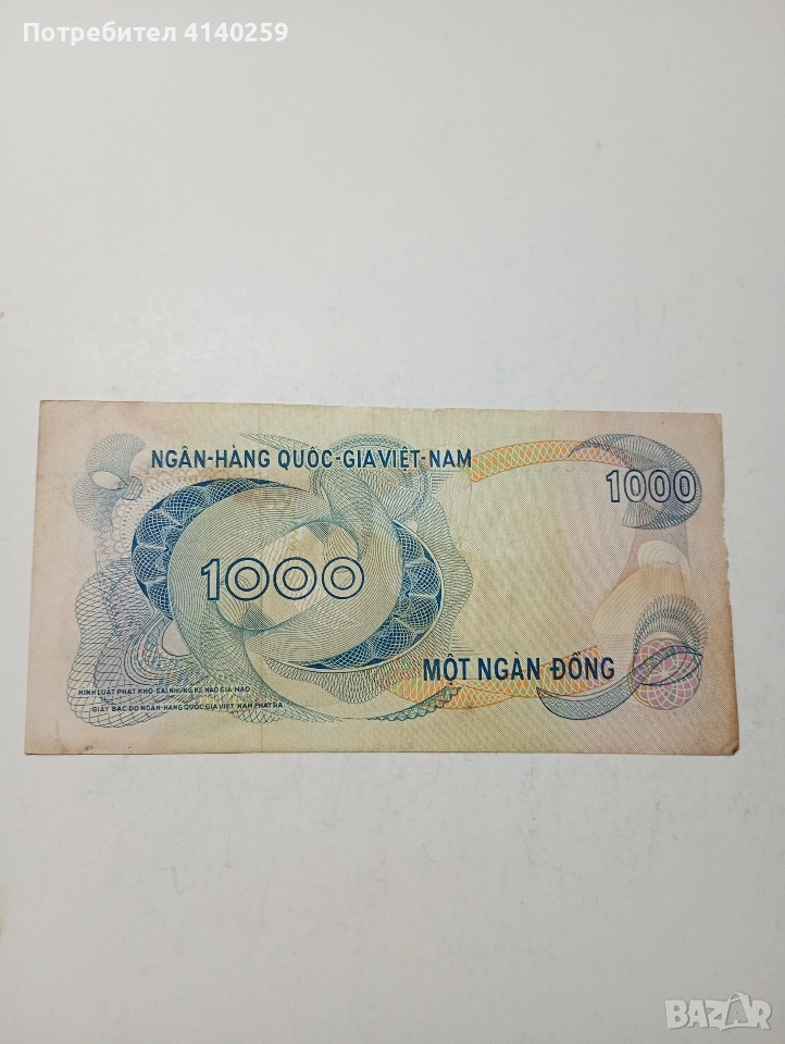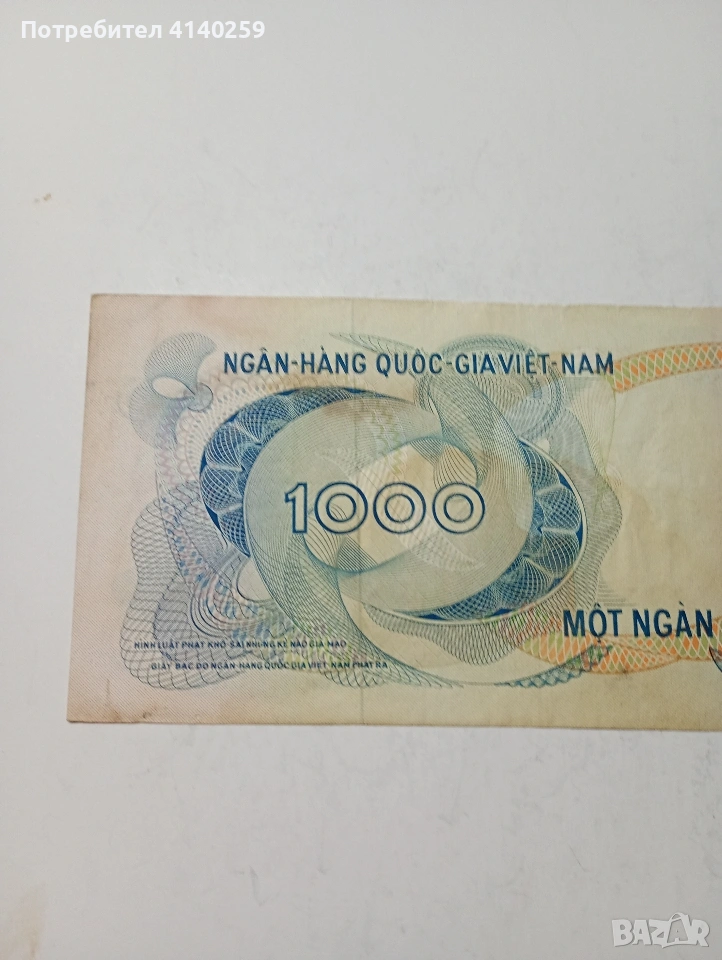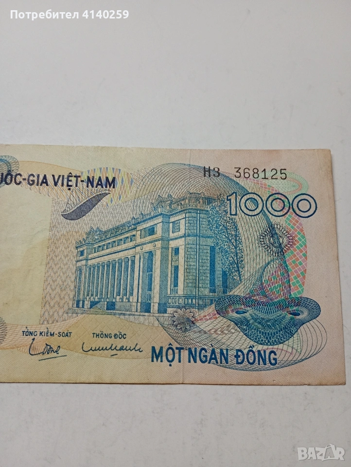 ВИЕТНАМ БАНКНОТА 1000 ДОНГА 1971 Г СЪСТОЯНИЕ ВИДИМО ПОЛУЧАВАТЕ СНИМАНАТА БАНКНОТА РАЗГЛЕДАЙТЕ ДРУГИТЕ МИ ОБЯВИ ДА КОМБИНИРАТЕ ДОСТАВКА ЕКОНТ ЗА ВАРНА ЛИЧНО