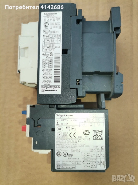 Здравейте, продавам контактор марка Schneider Electric LC1D38, с параметри Ith: 50A, Ui: 690 V, Uimp: 6 kV, заедно с термична защита Schneider TeSys LRD с обхват на термична настройка 23 - 32 А. Цена 20 евро.