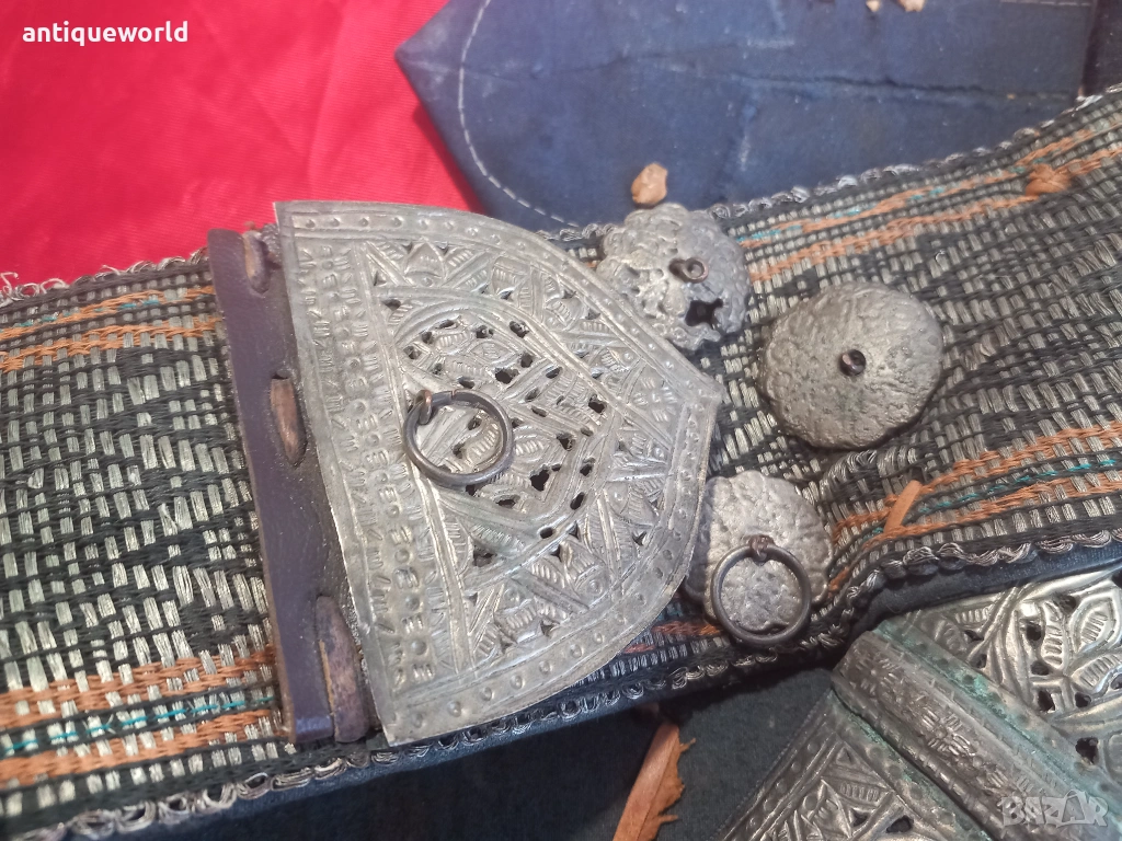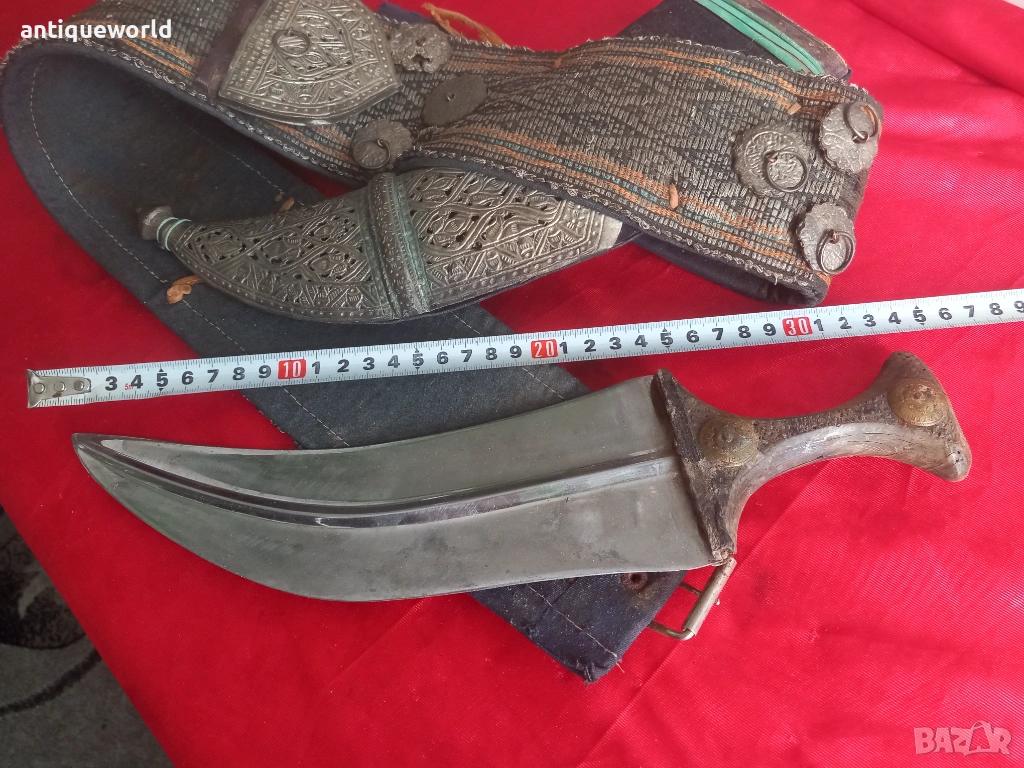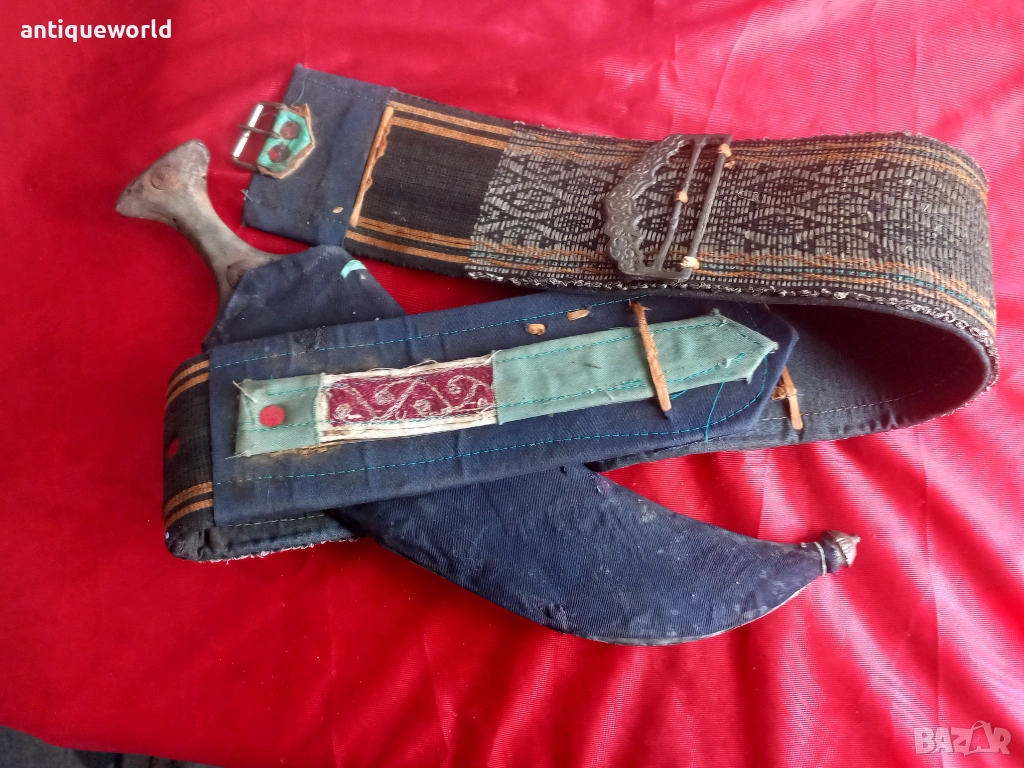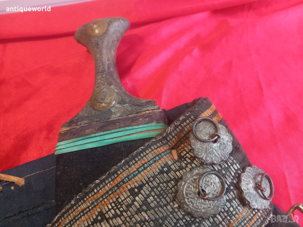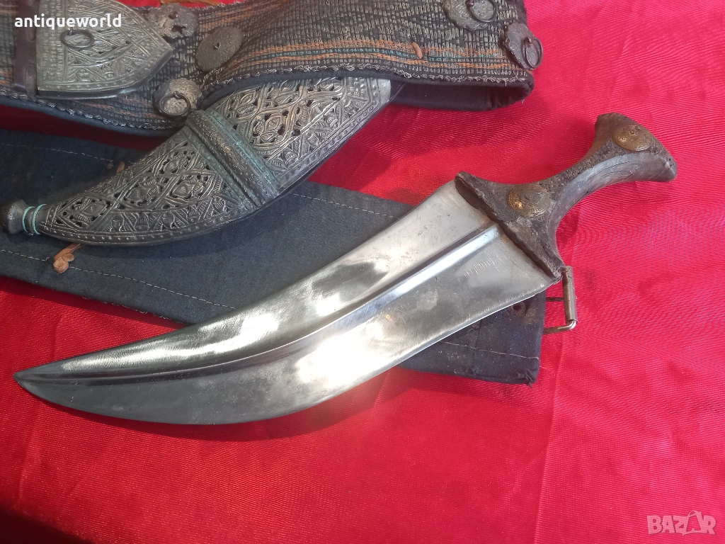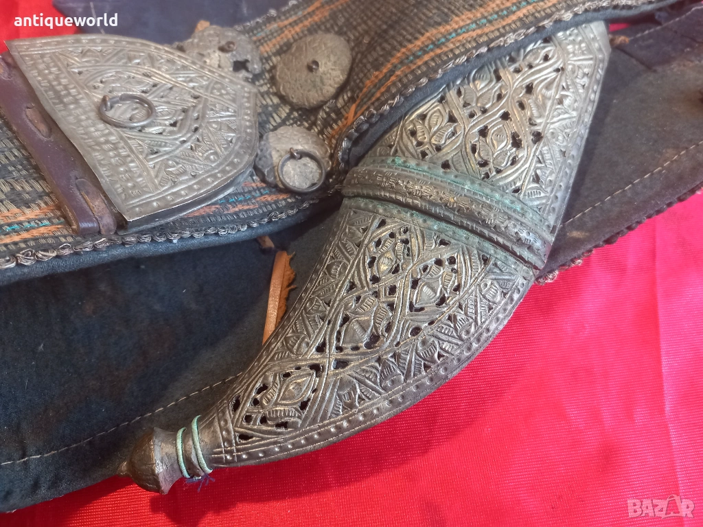 Изключително Красив Рядък Много Голям Стар Йеменски Ханджар, Джамбия,Кама със Сърмен Колан със Сребърни Елементи по Него. Дръжка от Кост от Носорог,Резливо Острие без Язви.Кания от Дърво Обвита с Кожа и Украсен с Филигранна Сребърна Декорация.Красота!