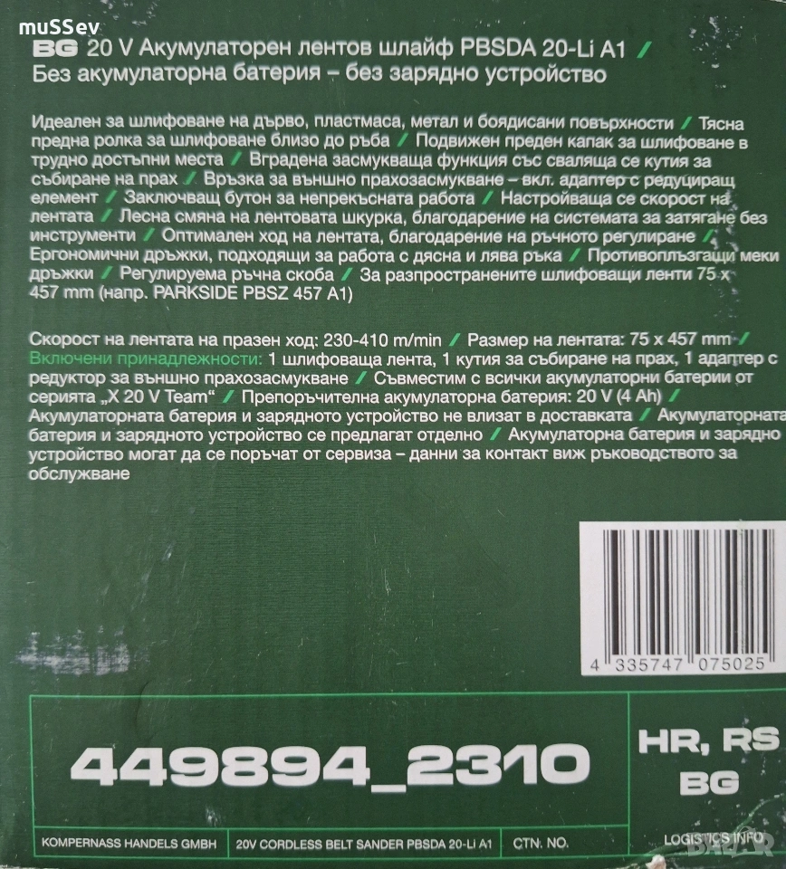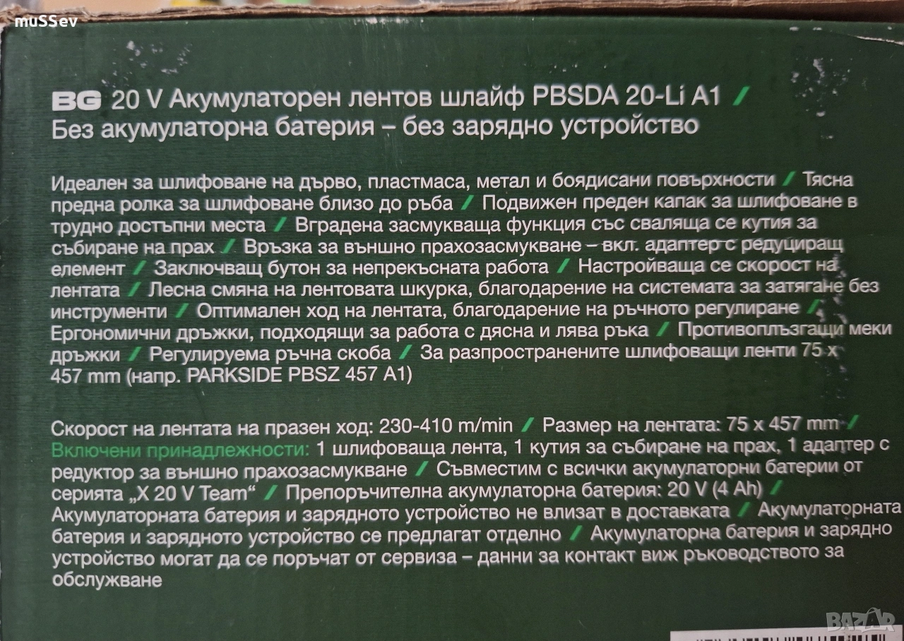 акумулаторен лентов шлайф Парксайд 20В Parkside PBSDA 20V A1 → Обява 53482139