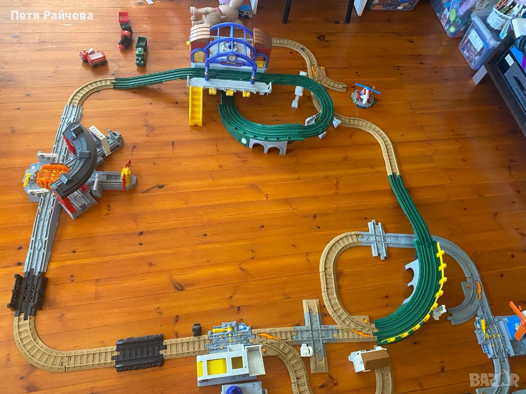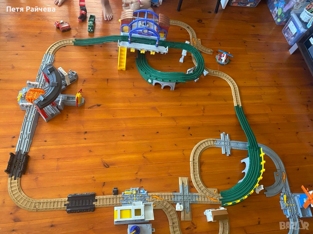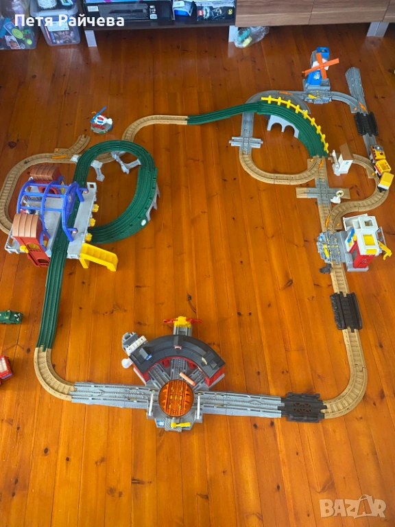 Много здрава и качествена изработка. Има три броя влакчета захранвани с батерии, работи само едното. Голяма гара, няколко спирки, мост. Може да се построи в различни варианти. Купувано е от английски сайт.