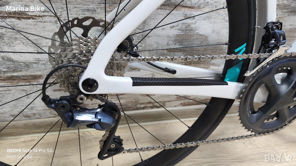 Велосипедът е сглобяван по индивидуален проект, оборудван с пълен механичен монтаж 2х11 скорости Shimano Ultegra R8020 с хидравлични дискови спирачки, алуминиеви капли от среден клас Fulcrum Racing 4 и компоненти Bianchi Reparto Corse.