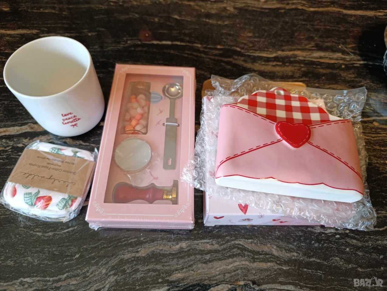 Памучни тампони за лице ,комплект за поставяне на восъчни печати ,чаша и керамична поставка за писма ,визитки и тн . Не ги деля ,всичко е чисто ново
