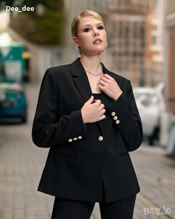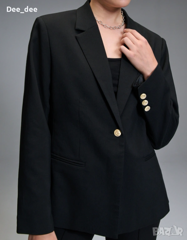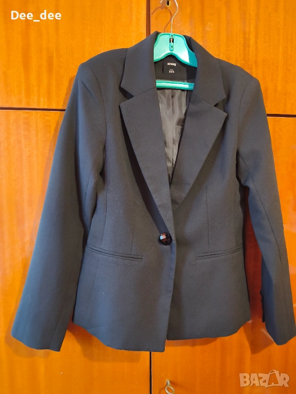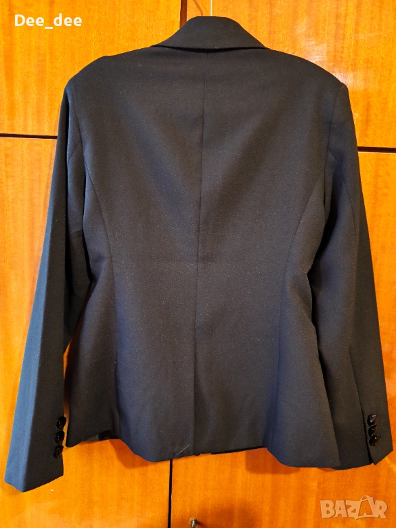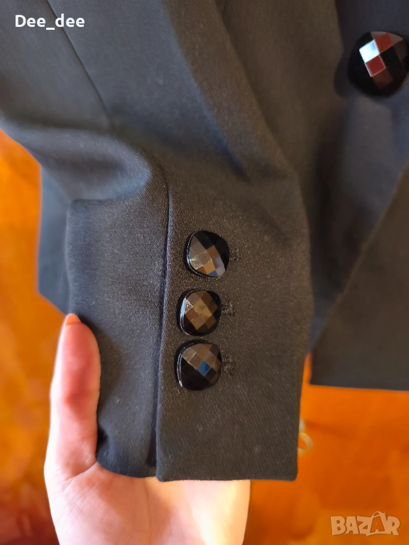 Носено е малко и съм сменила копчетата с черни. В оригинал бяха златни, както може да видите на снимките. Джобовете са само за украса. Съставът му е 83% полиестер.