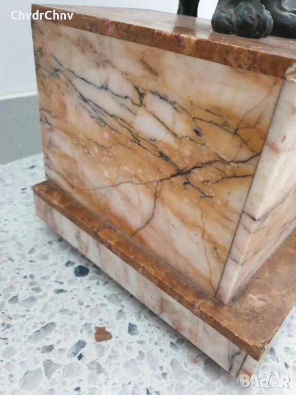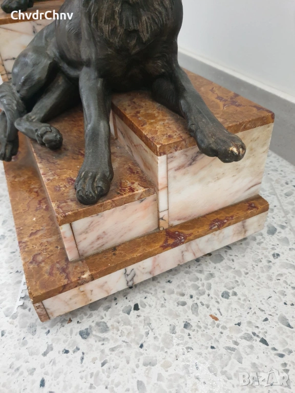 Височина 57 см, размери на основата 43х22 см (цветен мрамор, истински, не е композит, на няколко нива), тежи около 20 кг, две немски овчарки (приличат и на вълци).