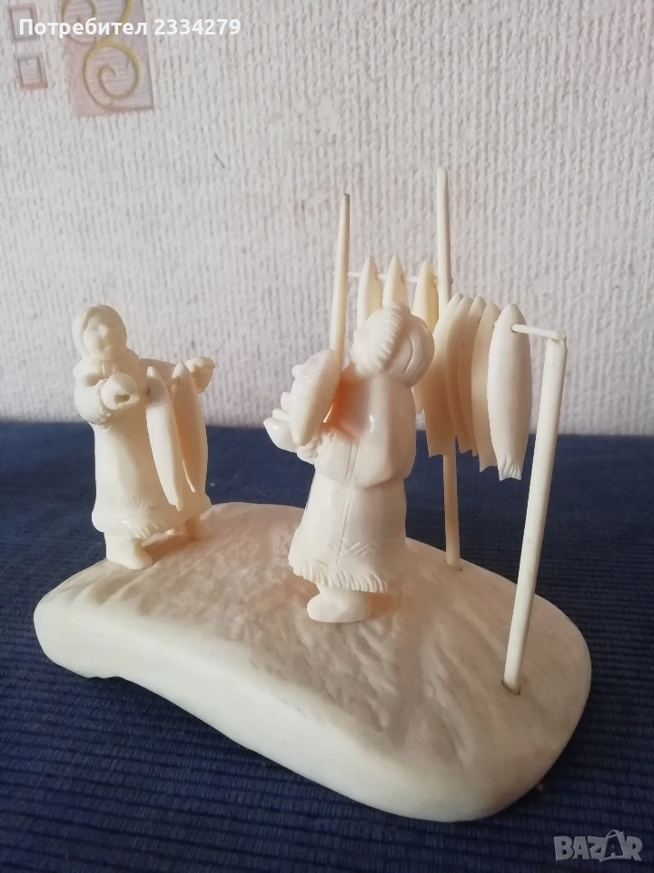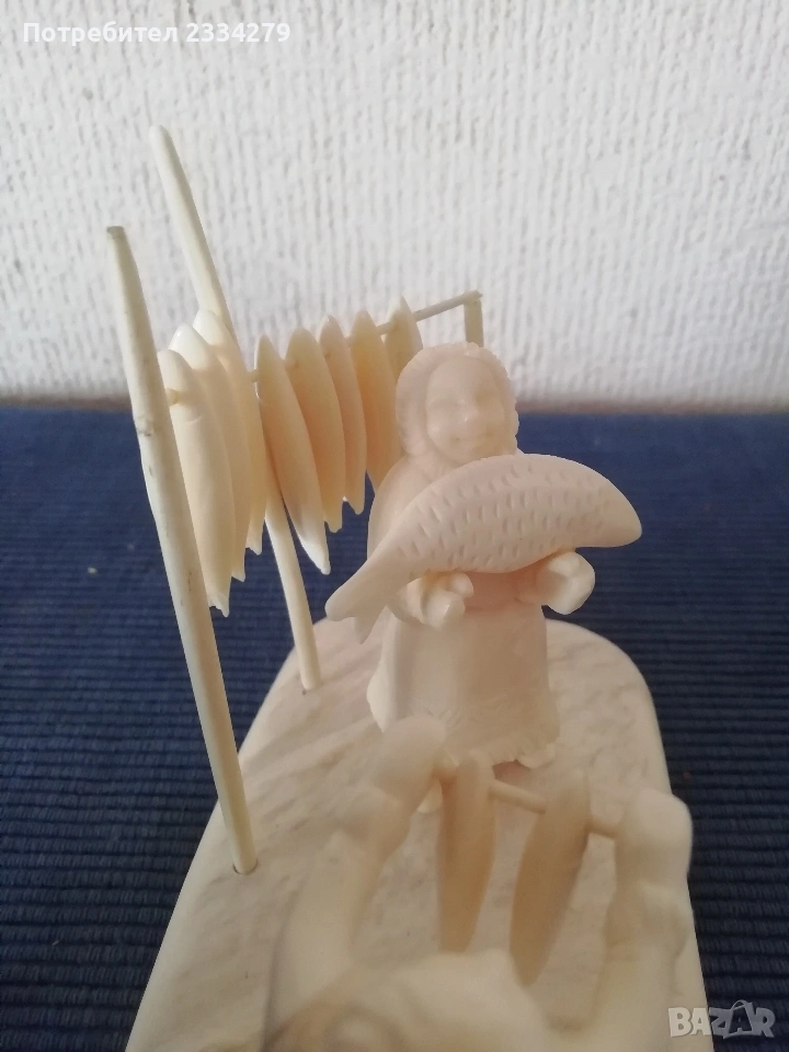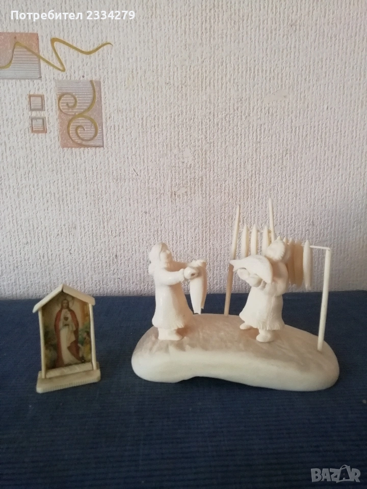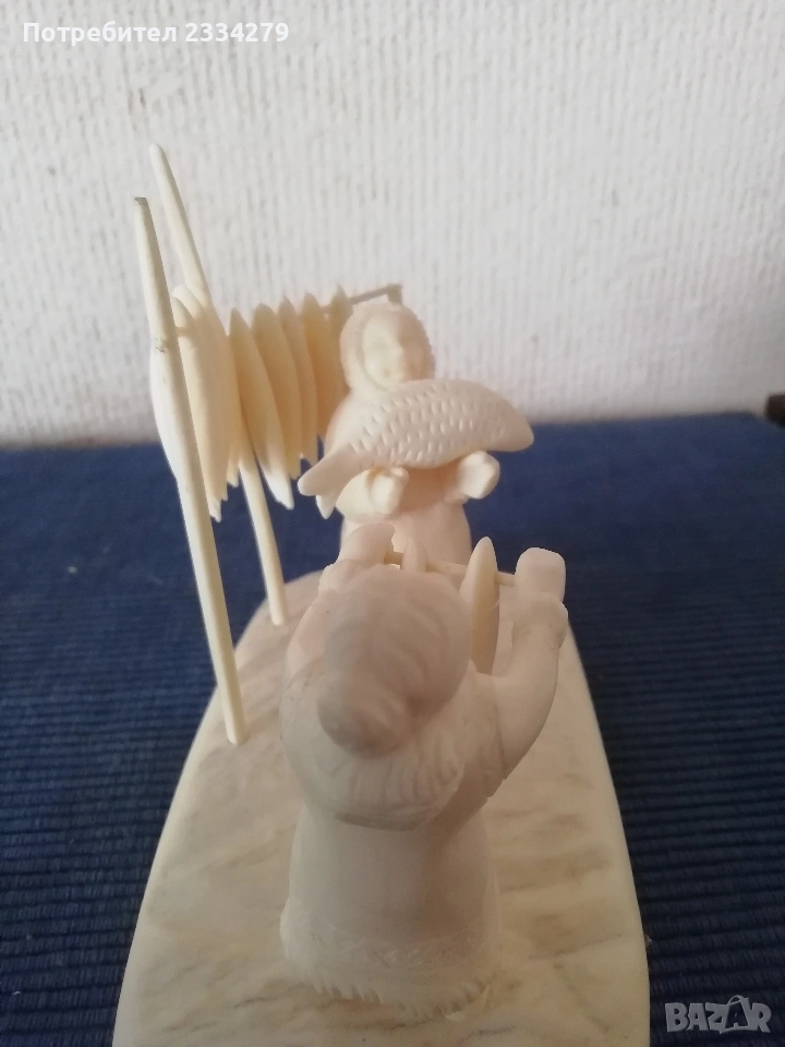 N:1 Фигурална композиция изработена от кост на морж, изобразяваща битова сцена от живота на народите от Северна. Ръчно изработена резбована от естествена кост от морж, размери дължина 15х8см., височина 12см., цена €.; N:2 Ръчно изработен миниатюрен олтар изобразяващ Исус Христос с бокал( Евхаристическата чаша). Изработен от слонова кост, размери 7х4х2см., цена €.