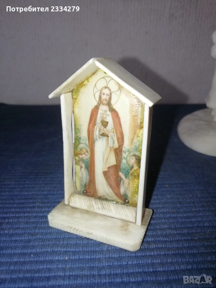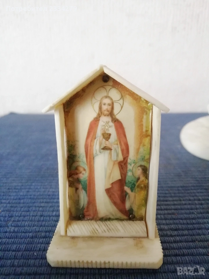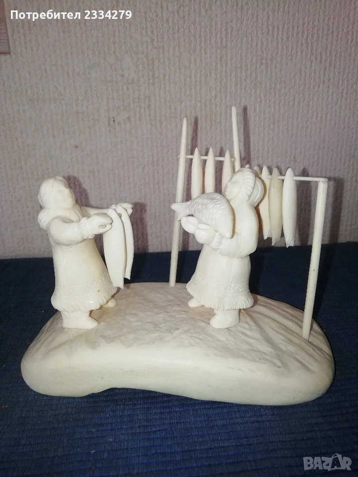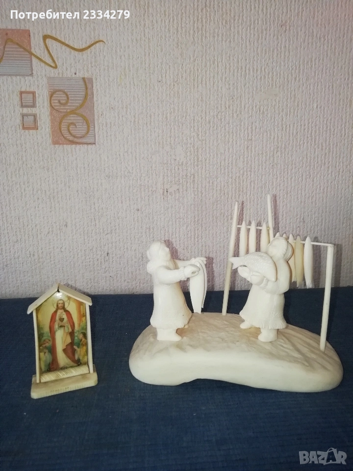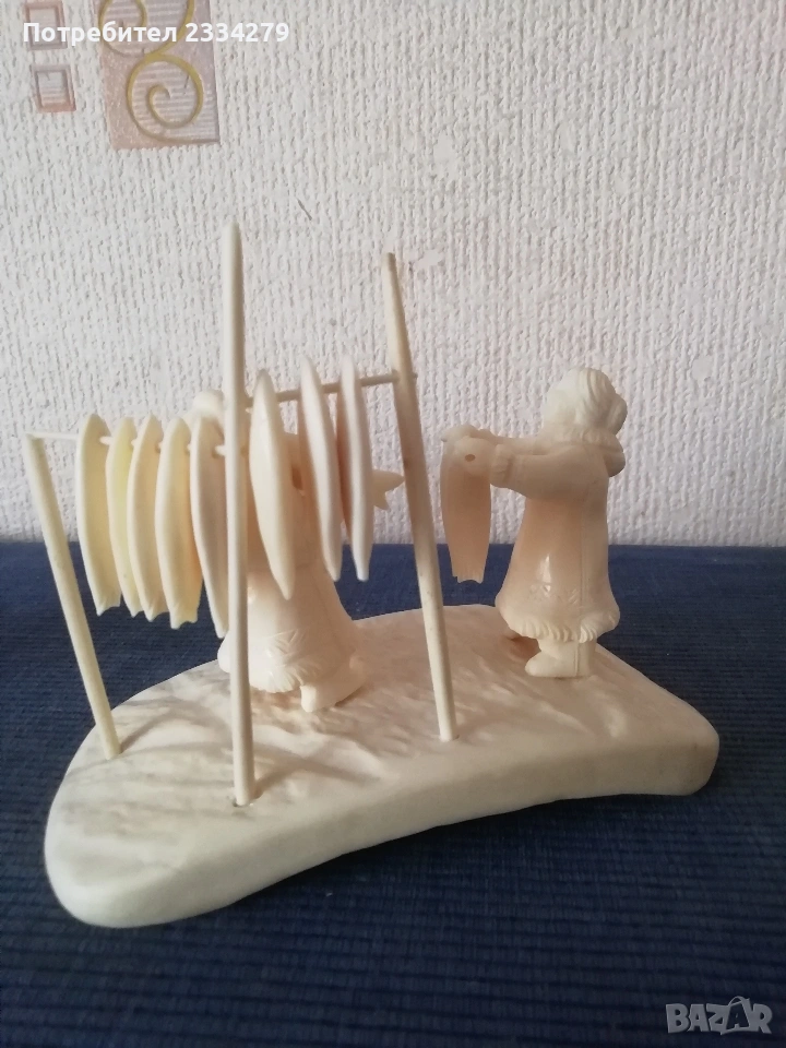 N:1 Фигурална композиция изработена от кост на морж, изобразяваща битова сцена от живота на народите от Северна. Ръчно изработена резбована от естествена кост от морж, размери дължина 15х8см., височина 12см., цена €.; N:2 Ръчно изработен миниатюрен олтар изобразяващ Исус Христос с бокал( Евхаристическата чаша). Изработен от слонова кост, размери 7х4х2см., цена €.