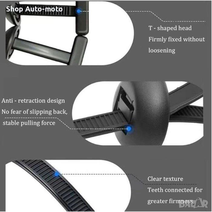 Кабелната връзка работи безпроблемно с различни видове пластмасови каишки, което я прави универсално решение за организиране и закрепване на предмети.