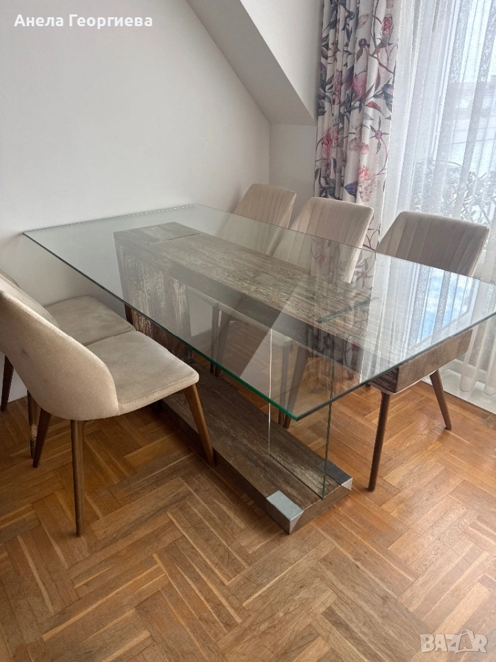 Дизайнерска трапезарна маса от естествена талпа и стъкло! Размер 90/170 много красива и здрава! При закупуването на столовете от друга обява и масата заедно комплексна цена! За Варна, Шумен и региона мога да направя безплатна доставка!