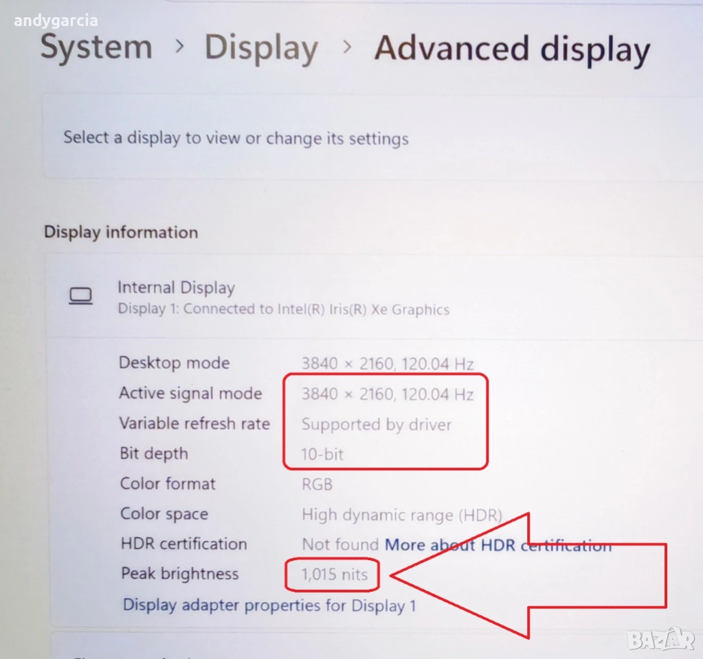 Убийствена яркост HDR 1000, масовo лаптопите са с до 300 нита, а 400-500 е рядко срещано.