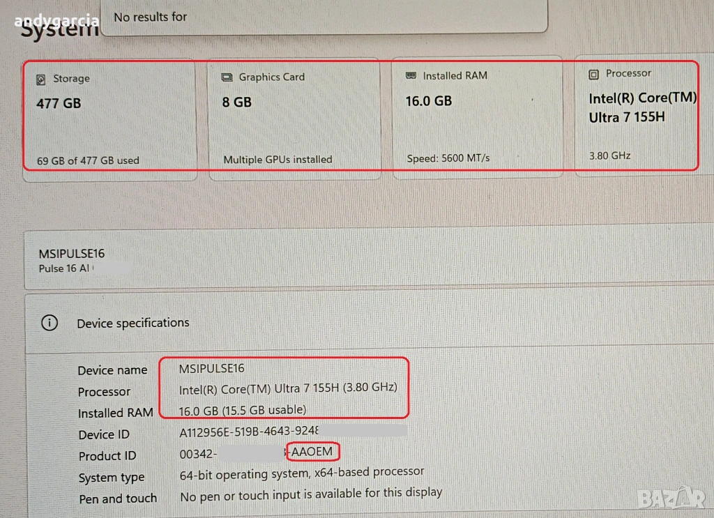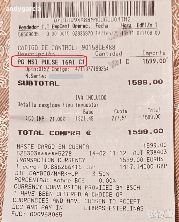 Лаптопа е закупен от Испания на 14/02/2025 год. с наличен касов бон за 1600€ и гаранция още 12 месеца.