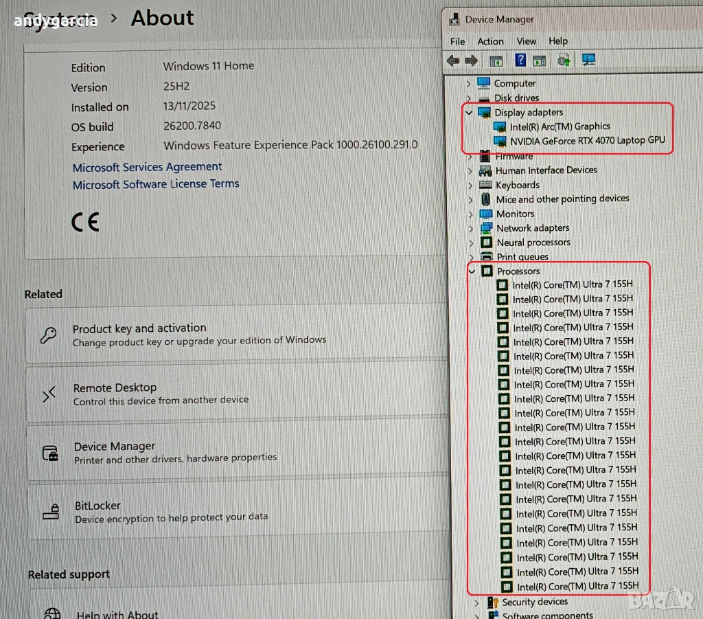 Intel Core Ultra 7 155H и NVidia RTX 4070 8GB 140W.