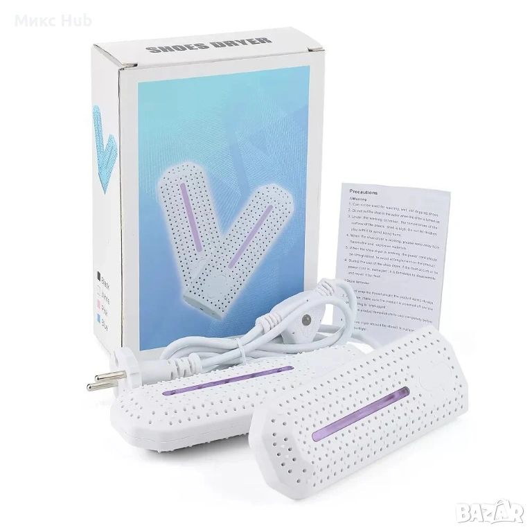 Сушилня за обувки и UV стерилизатор 2в1. Изсушава бързо, стерилизира, премахва миризми, дезодорира. Подходяща за обувки от различни материали. Мощност - 10 W. Дължина на кабел -1.1 м.