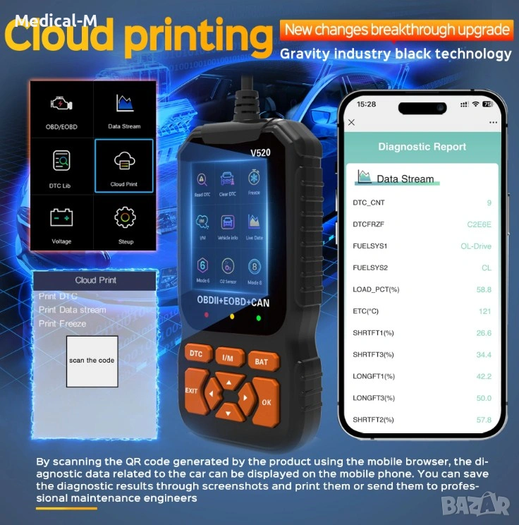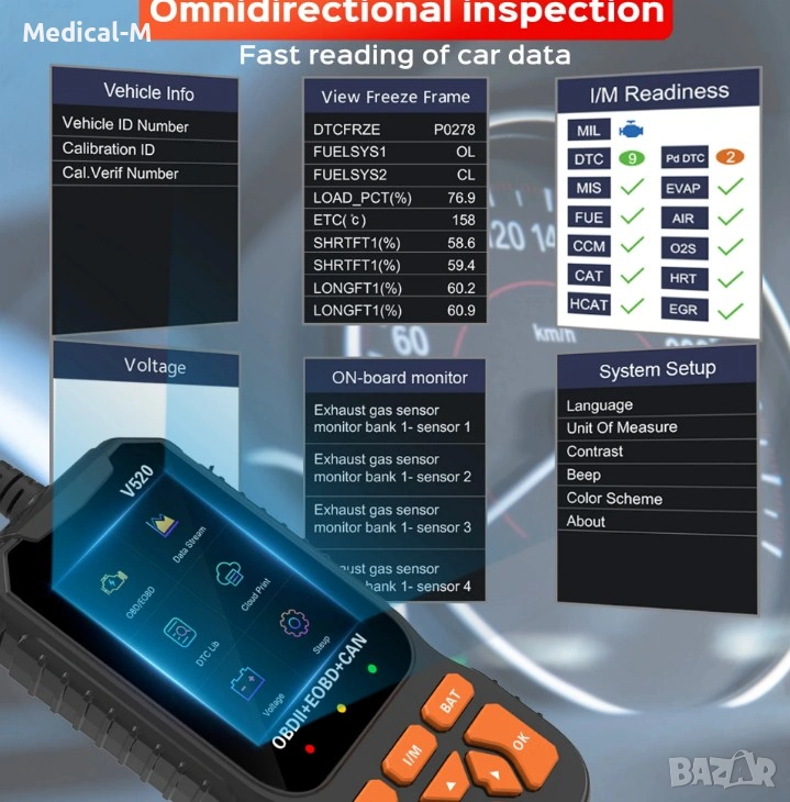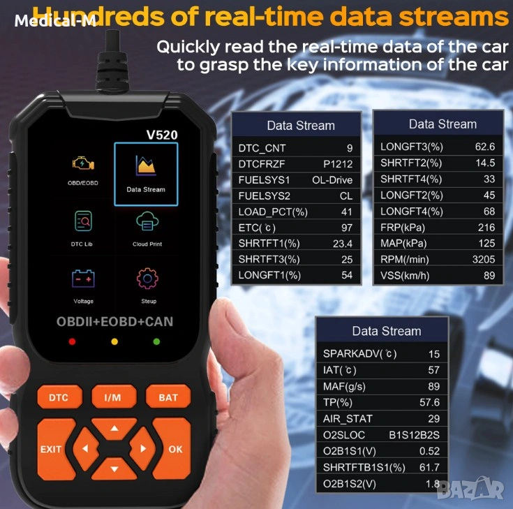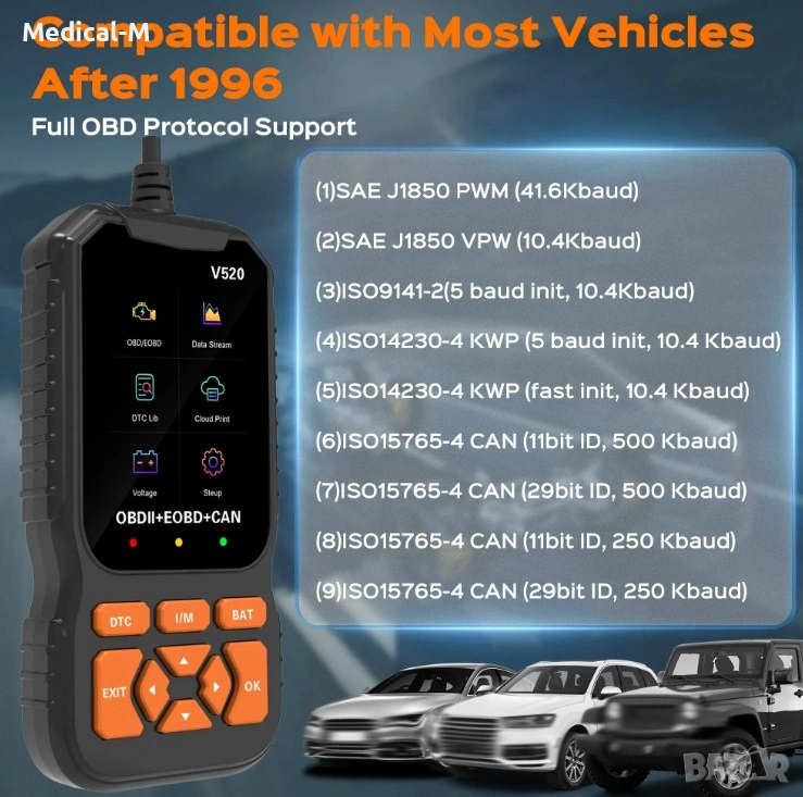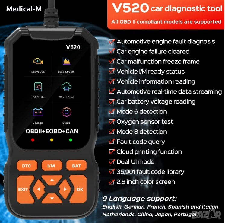 Продукт: V520 е многофункционален инструмент за диагностика на автомобилни неизправности, който поддържа девет стандартни протокола OBD II