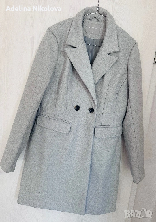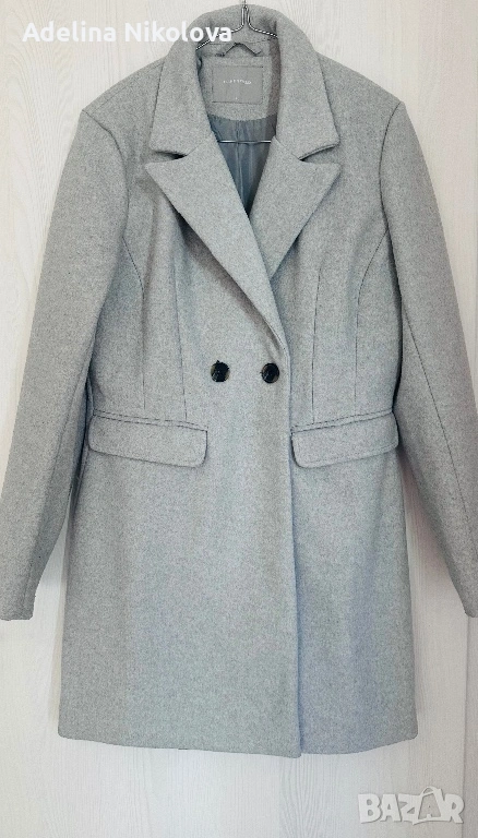 Дамското палто е в базов сив цвят. Използвано 1,2 пъти, в отлично състояние. Гр обиколка 106см дължина 88см, втален модел с подплата