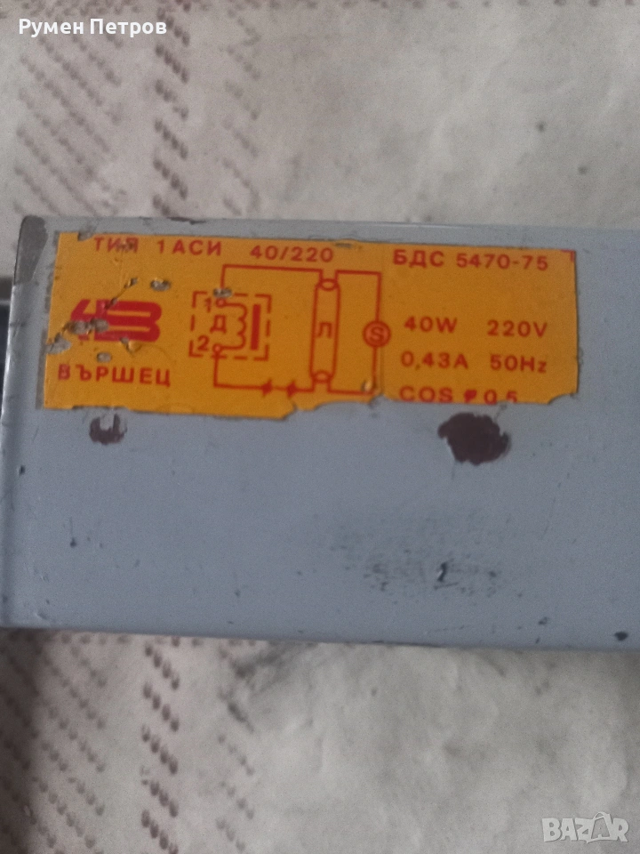 Електромагнитен дросел (баласт) за луминесцентни лампи, произведен в България. Той ограничава тока, протичащ през лампата, за да предотврати нейното изгаряне. Модел: ТИЯ ТАСИ 40/220 Мощност: 40W Напрежение: 220V Честота: 50Hz Стандарт: БДС 5470-75 Производител: ВЪРШЕЦ Спецификации: 40W 220V, 0,43A 50Hz, COS 0,5 Стандарт: БДС 5470-75 В добро състояние.
