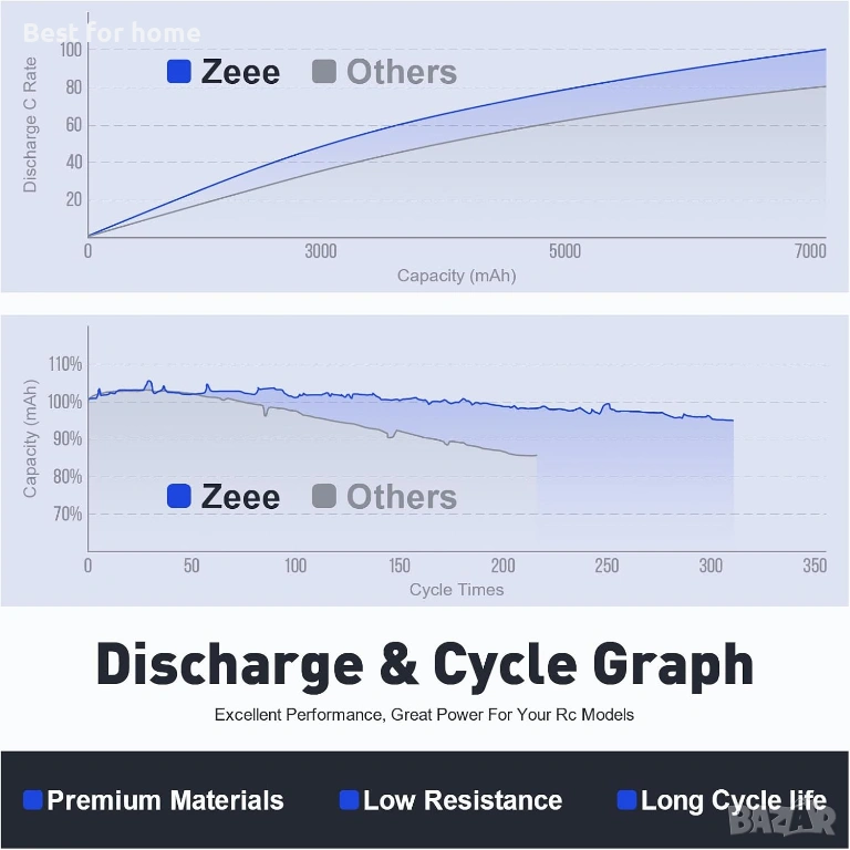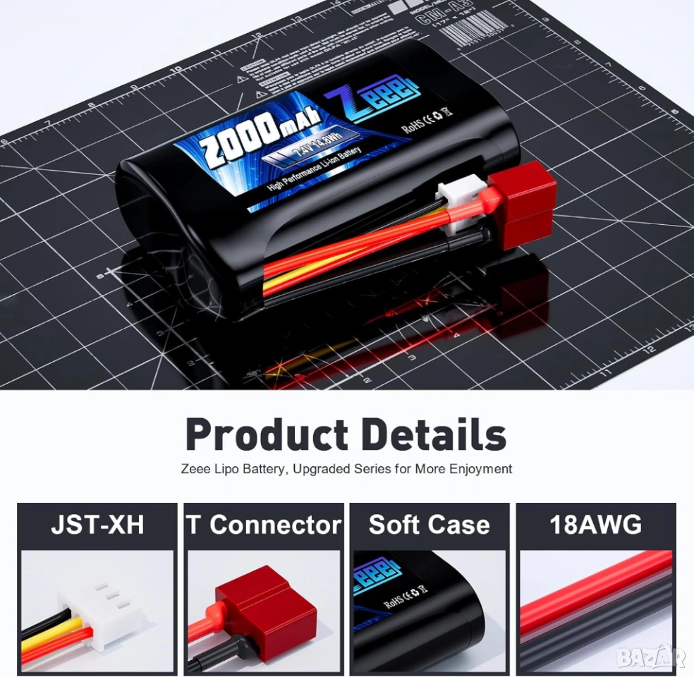 【Спецификация на литиево-йонна батерия Zeee 2S 2000mAh】- Напрежение на батерията: 7.4V; Капацитет: 2000mAh; Разреждане: 15C; Щепсел: Т-образен конектор.