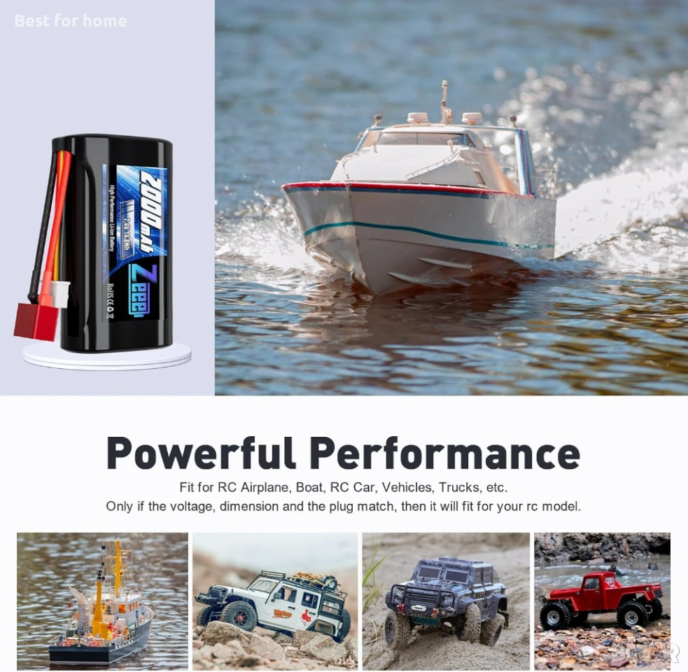 【Приложение за 7.4V Lipo】 - Zeee 2000mAh 2S RC литиево-йонна батерия с Т-образен конектор, съвместима с 1/10, 1/12, 1/16 RC коли, RC камиони и др. (Само ако напрежението, размерите и щепселът съвпадат, тогава ще пасне).