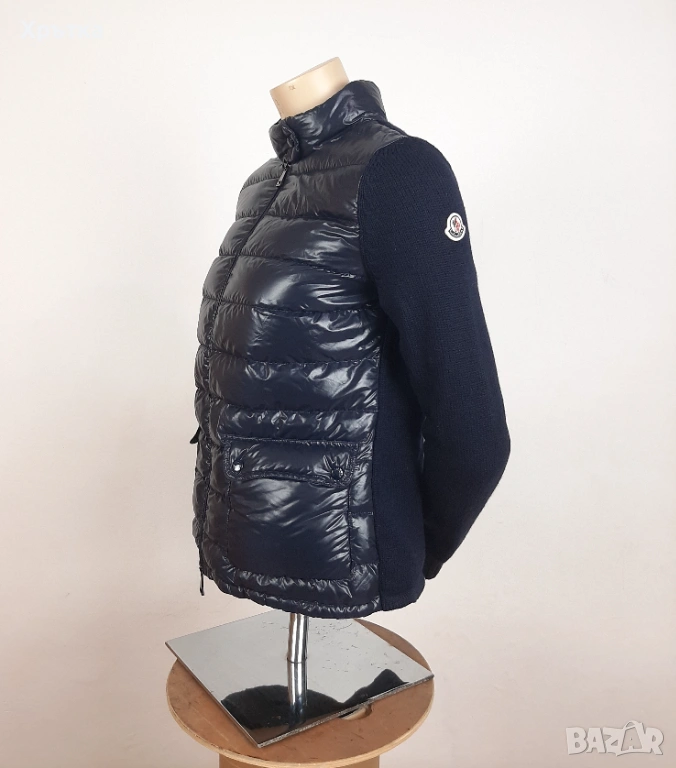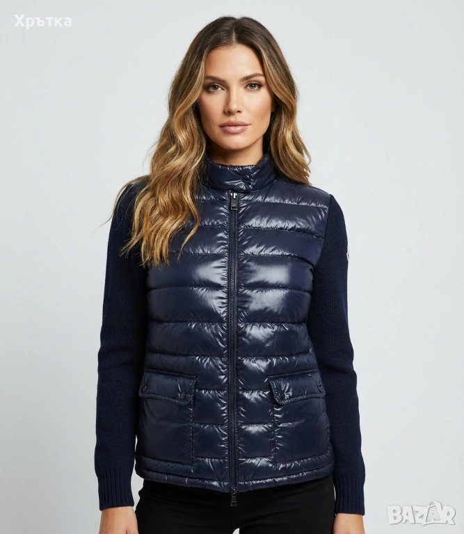 Премиум хибридно яке Moncler, комбиниращо пухена капитонирана предна част с вълнени плетени ръкави.
