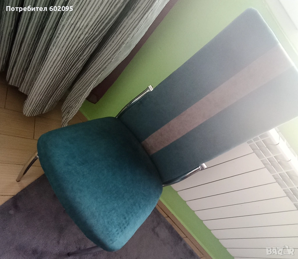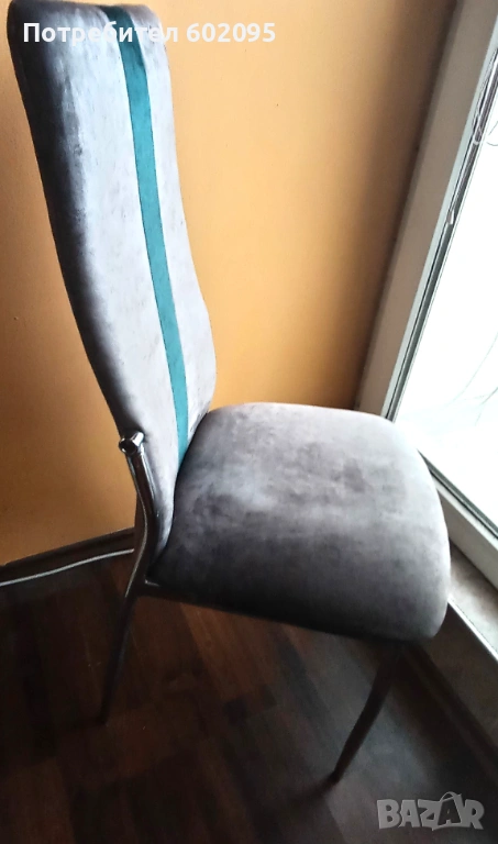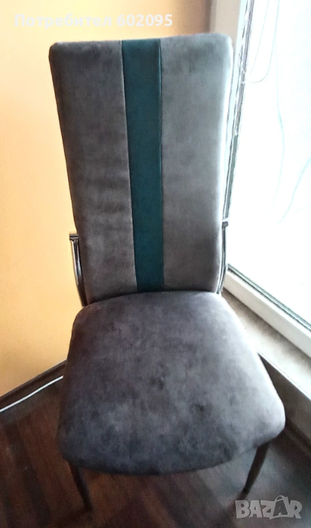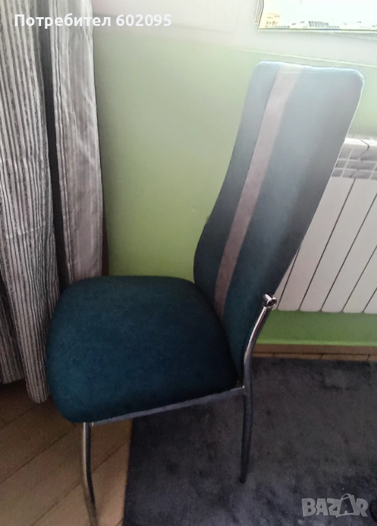 Тапицирани трапезни столове, комплект 4 бр, 2 сиви със зелена ивица и 2 зелени със сива ивица, тапицерията е водонепропусклива и устойчива на дом. любимци, лесна за поддържане. Столовете са почти нови, ползвани са като поставки за дрехи в спалните през цялото време. Цената е за комплекта, при желание може и да се раздели комплекта. Размерите са 45/47/101см, дълб. седалка 40см.