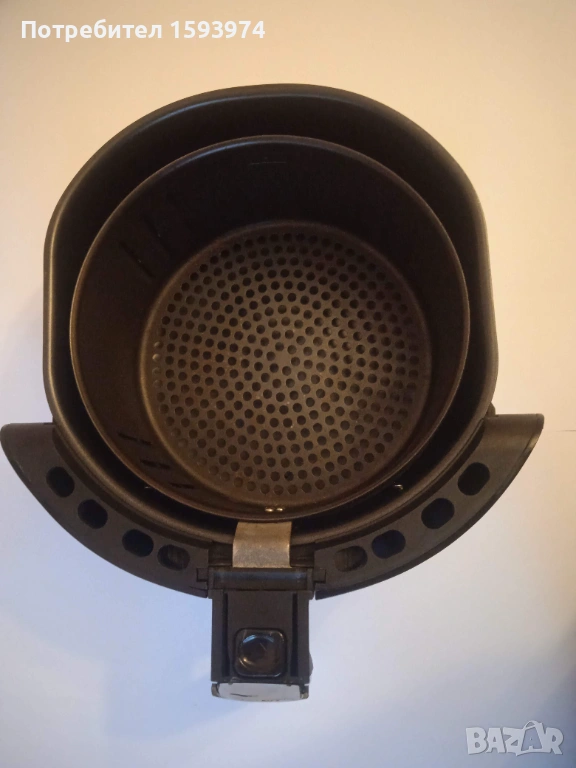Уредът притежава 2.6-литрова кошница и съд за мазнина, които