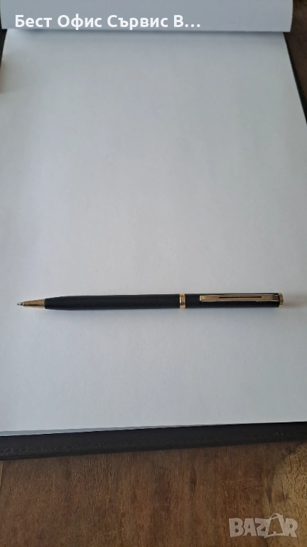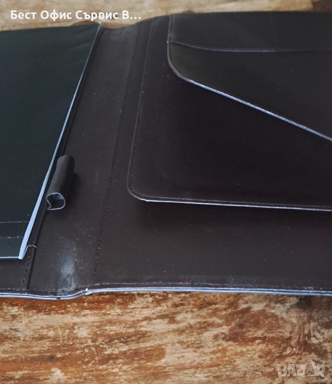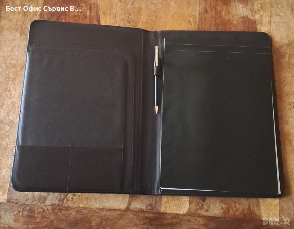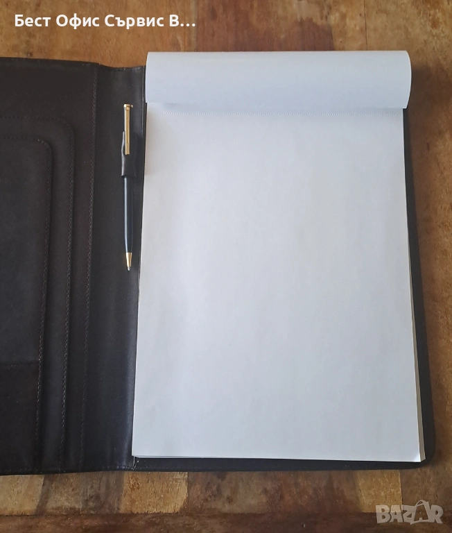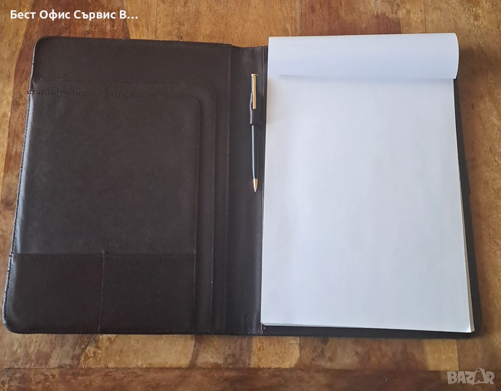 Продавам папка луксозна за документи тъмнокафява естествена кожа с химикалка А4. Има 4 джоба за визитки и документи. Има и 1 място за химикалка. Бележникът за писане с редове е с размери 21x29,5 см и има 30 листа. Има и химикалка черна матова и позлатена, която пише с пълнител тип "крос". Папката за документи е с размери 124x33x2 см. В оригиналната кутия с размери 24,33,5x2,5 см. Има две леки вдлъбнатини в горната и долната част на папката. Папката е чисто нова. От частна колекция. За ценители. Имам няколко бройки.