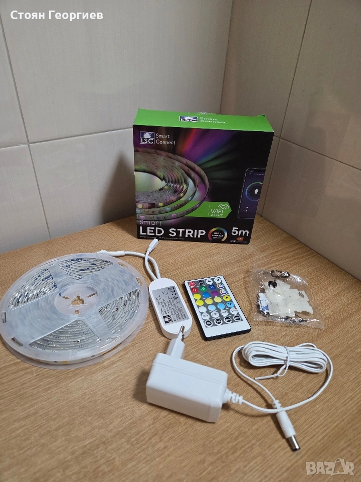 LSC Smart Connect LED лента с дължина 5 метра. Функционалност: Смарт лентата се свързва чрез Wi-Fi и позволява управление чрез приложение или включеното в комплекта дистанционно управление. Осветление: Предлага RGB (цветно) осветление и различни светлинни ефекти. Комплект: Включва LED лента, захранващ адаптер, контролер, дистанционно и крепежни елементи.
