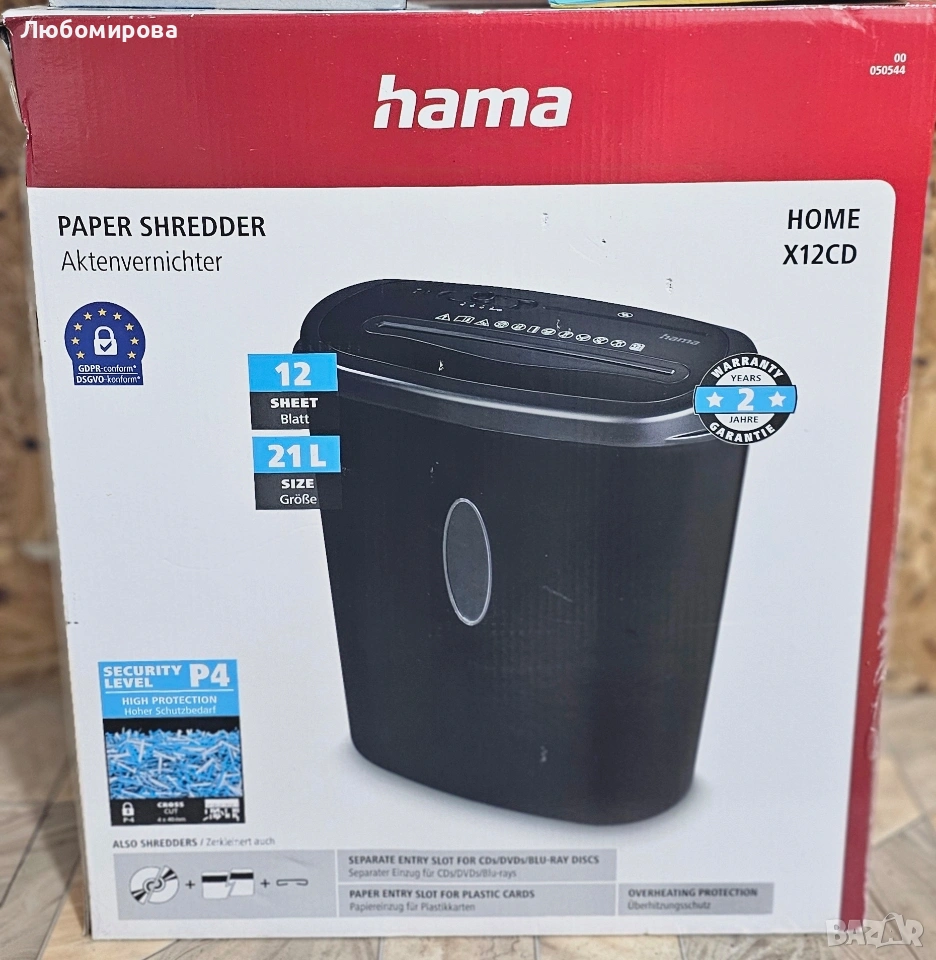 Шредерът Home X12CD от Hama е вашият практичен и ежедневен помощник за сигурно унищожаване на лични данни. Той се справя успешно с раздробяването на поща, файлове и листове с данни, като ги прави на малки фрагменти, а отпадъците от хартия попадат директно в контейнера. Контейнерът е с обем 21 l и разполага с прозорче, през което може да следите кога е време да изпразните кошчето. Home X12CD има допълнително подаване за CD, DVD, Blu-Rays и пластмасови карти. По този начин, безопасно могат да се унищожават носители на данни и карти за лоялност. Остатъците от тях се събират в контейнер и могат да се изхвърлят устойчиво и отделно от хартията. Уредът за раздробяване на документи може да унищожи до 13 листа хартия с формат A4 и плътност 70 g/m2 наведнъж. Висококачествените стоманени блокове нарязват вашите лични документи на тънки хартиени ленти - 4 mm. Този размер на изрязване съответства с нивото за сигурност P-4 и клас за защита 2 съгласно DIN 66399. С функцията за автоматично стартиране и спиране, шредерът автоматично започва да раздробява, когато материалът се вкарва в подаващото устройство и спира веднага щом процесът приключи. Шредерът разполага с предпазно устройство, така че режещите ролки се завъртат, само когато главата на устройството е поставена правилно върху хартиената кошница. В противен случай, вграденото устройство ще предотврати раздробяването. С функцията за обръщане може лесно да се изчисти заседнала хартия, ако бъдат поставени твърде много листове или заседнал документ трябва да бъде освободен. Home X12CD има и защита от прегряване, за която ви сигнализира LED индикатор. Характеристики: * функция за автоматично стартиране и спиране * функция за обръщане * контейнер за събиране на CD, DVD, Blu-ray дискове *предпазното устройство * защита от прегряване * обем на контейнера за хартия: 21 l * обем на контейнера за дискове и пластмасови карти: 0.8 l * размери: 36.2 / 45.2 / 19.5 cm