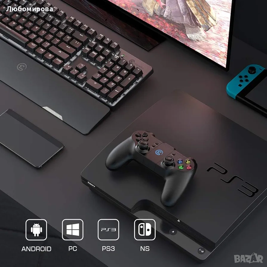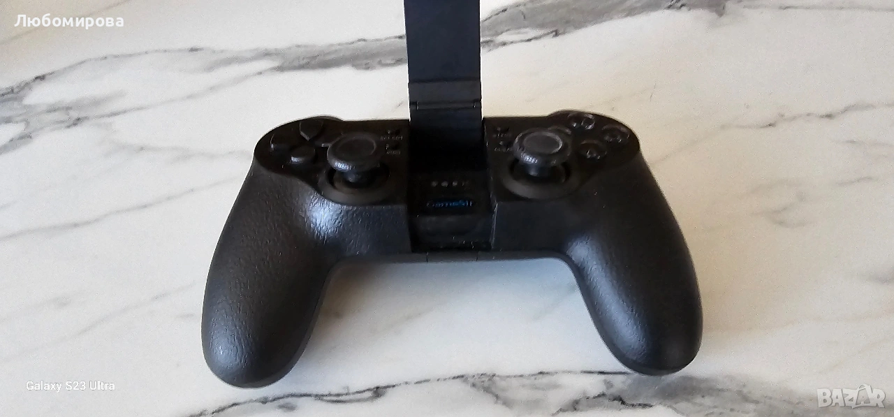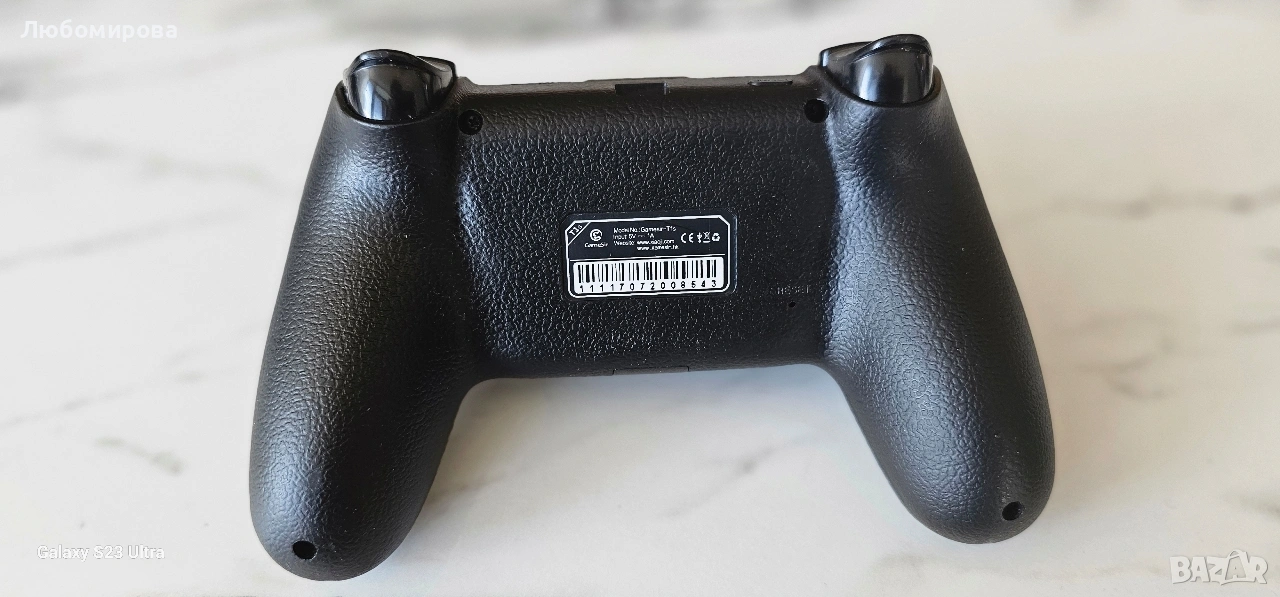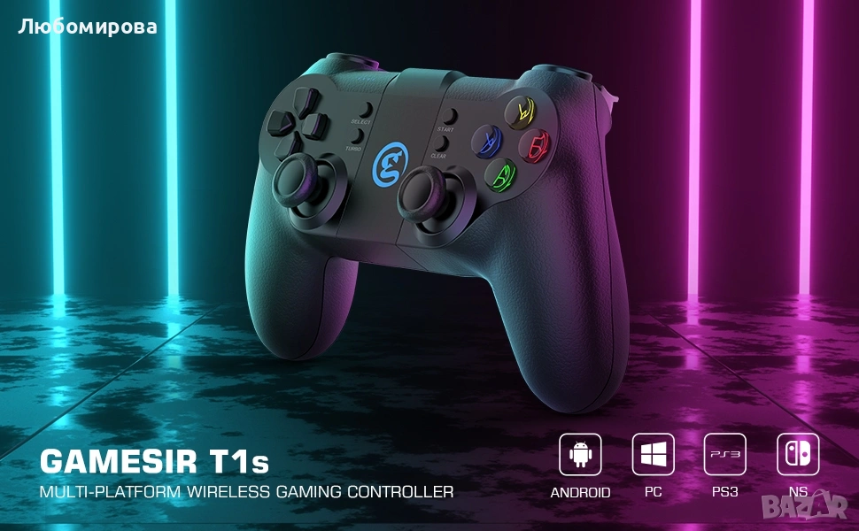 Геймпадът GameSir T1s е универсален безжичен контролер, който поддържа широк набор от платформи чрез Bluetooth 4.0, 2.4GHz безжична връзка (чрез USB донгъл) и кабелна връзка. Дизайнът му е вдъхновен от Sony DualShock 4, но използва ABXY подредба на бутоните, характерна за Xbox. Съвместимост и свързаност Контролерът е проектиран да работи с множество устройства, като автоматично идентифицира платформата в повечето случаи. PC (Windows): Поддържа Windows XP/7/8/10 чрез 2.4GHz донгъл или USB кабел. Разпознава се като Xbox контролер (X-Input). Sony PlayStation 3: Свързва се безжично или чрез кабел, като осигурява пълна функционалност за конзолата. Android: Съвместим със смартфони, таблети, TV боксове и VR очила (като Samsung Gear VR) чрез Bluetooth 4.0. iOS: Поддръжката е ограничена, тъй като устройството не е MFi-сертифицирано. Често изисква допълнителен софтуер като емулатора Happy Chick. Други: Поддържа Nintendo Switch, SteamOS и Nvidia Shield. Основни характеристики Батерия: Вградена 600mAh (или 800mAh според някои източници) литиево-полимерна батерия, осигуряваща до 18 часа игра. Зарежда се за около 2-3 часа. Ергономичност: Текстуриран захват (наподобяващ кожа) за по-добро сцепление и вградена регулируема стойка за смартфони с размер от 3.5 до 6 инча. Вибрация: Двойни асиметрични мотори за реалистична обратна връзка при удари и експлозии (интензитетът може да се регулира). Допълнителни функции: Поддържа Turbo функция за бърза стрелба и LED индикатори за нивото на батерията.