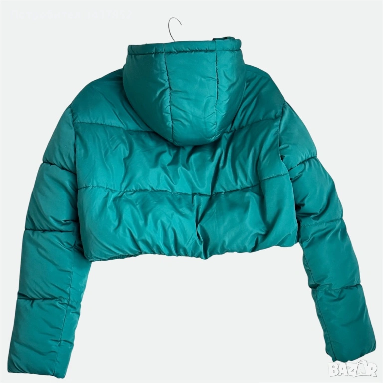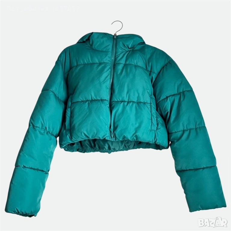 Дамско късо пухкаво яке синьо-зелен тюркоазен нюанс.Размер М