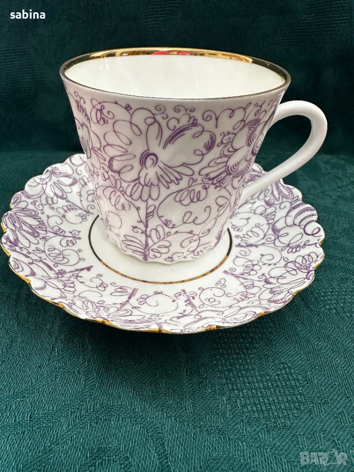 Двоен сет „Садик“ („Градинка“) от костен порцелан на ЛФЗ (Ленинградский фарфоровый завод „Ломоносов“), СССР – 1970 -1990 г. Форма „Витая“ (Усукана). Автор на рисунък – Нина Славина. Вместимост 170 мл. Подложна чиния – с дантелен завършек, 12,5 см. Прекрасно качество. Налични 5 сета. Цена за 1 брой двоен сет – 35 евро