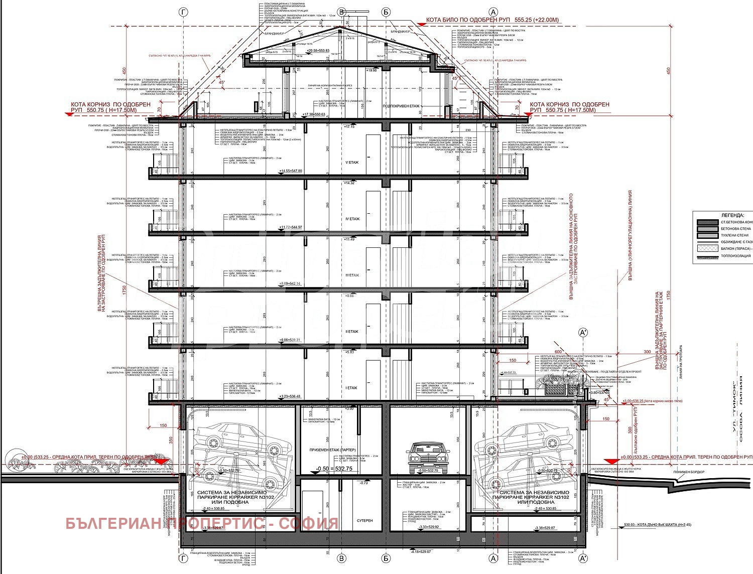 В сутерена са разположени долните нива на гаражните клетки с устройства за независимо паркиране, складови помещения, помещение за велосипеди и абонатната станция.