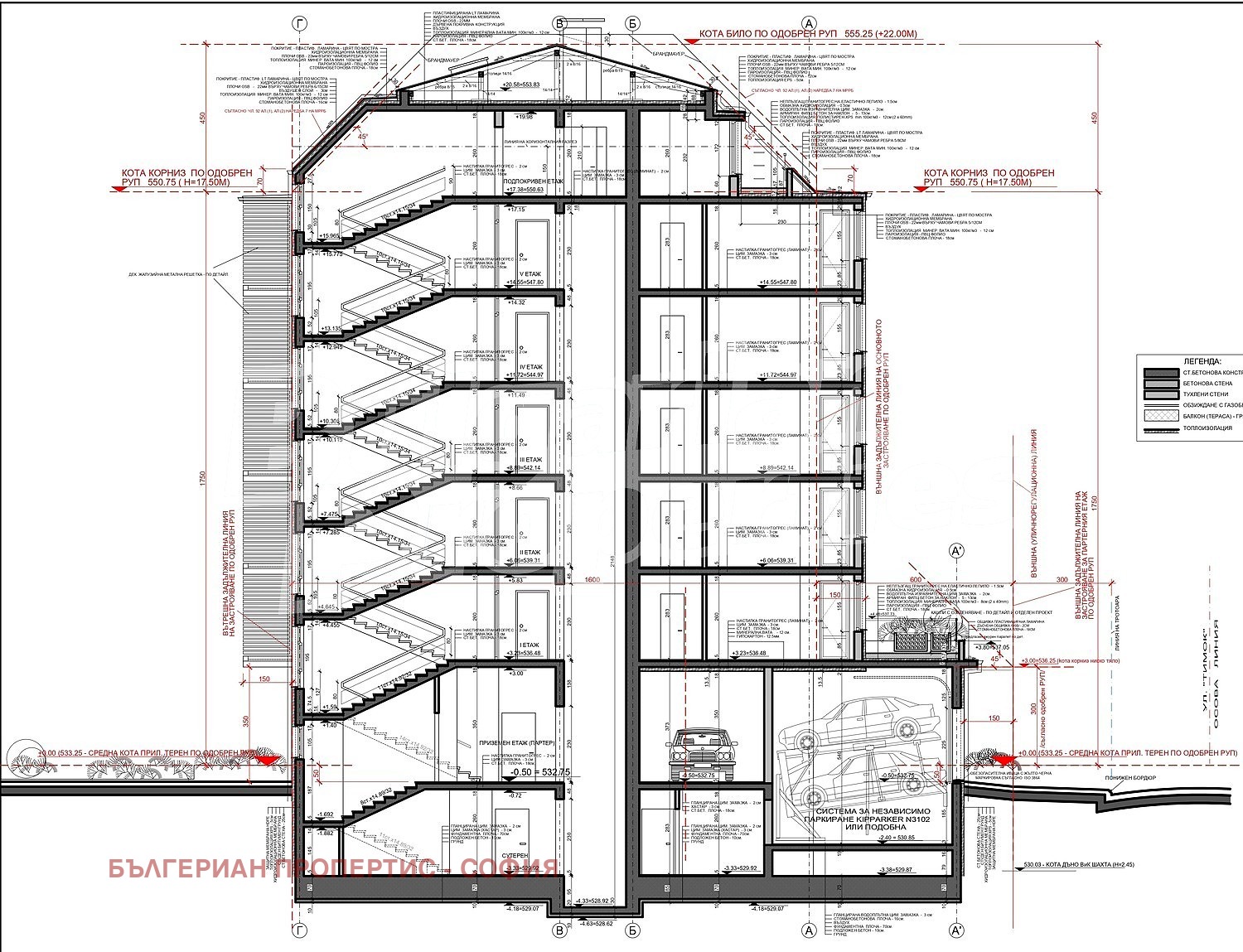 В сутерена са разположени долните нива на гаражните клетки с устройства за независимо паркиране, складови помещения, помещение за велосипеди и абонатната станция.