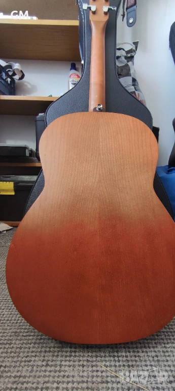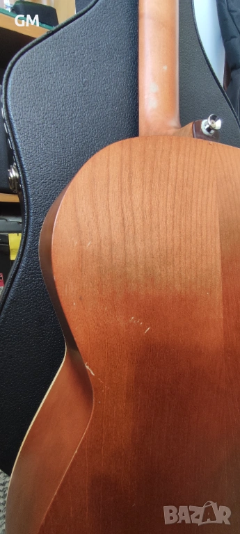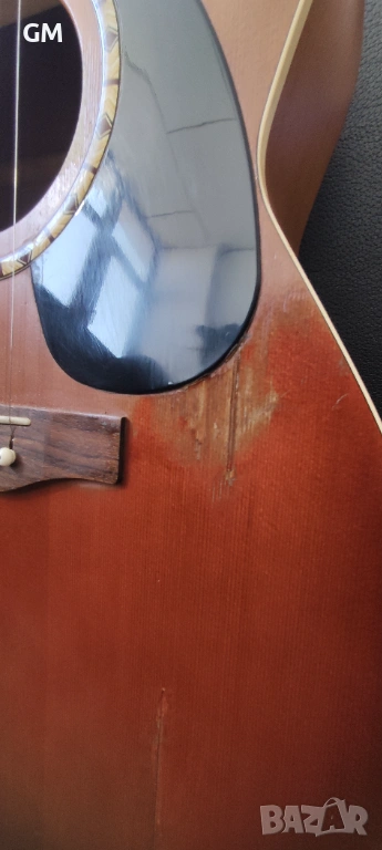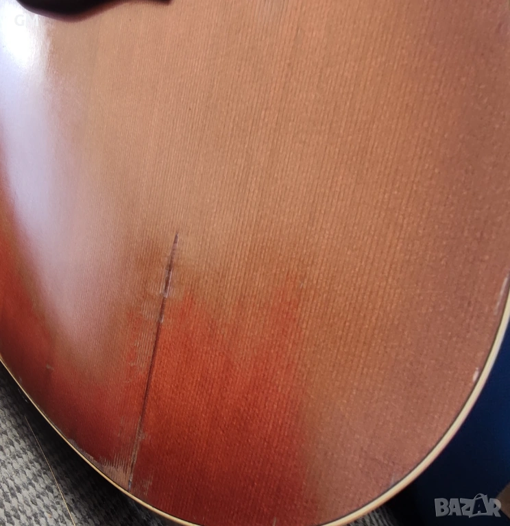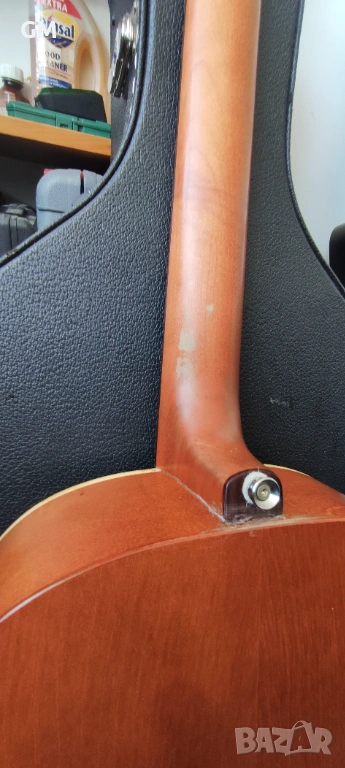 Това е една от бойните ми китари с много следи по нея от какво ли не, имаше цепнатини по корпуса, които са поправени заздравени отвътре и отвън но си личи че е првен ремонт ( мен нично ако свири добре китарата не ме вълнува какви следи има по нея ). Праговете са сменени със стоманени практически вечни (само те са 180€ ). В момента е със струни Еликсир 0.13 - 0.56 в Ре. Мога да я сетна и с подходящите струни за новия собственик, като си доплати единствено за стеуните които иска да се сложат. Има поставена пасивна електроника КОПИЕ на K&K mini, която с отделен преамп си работи доста добре. Разбира се работи и без такъв, но значително по-тихо.