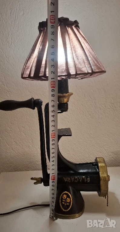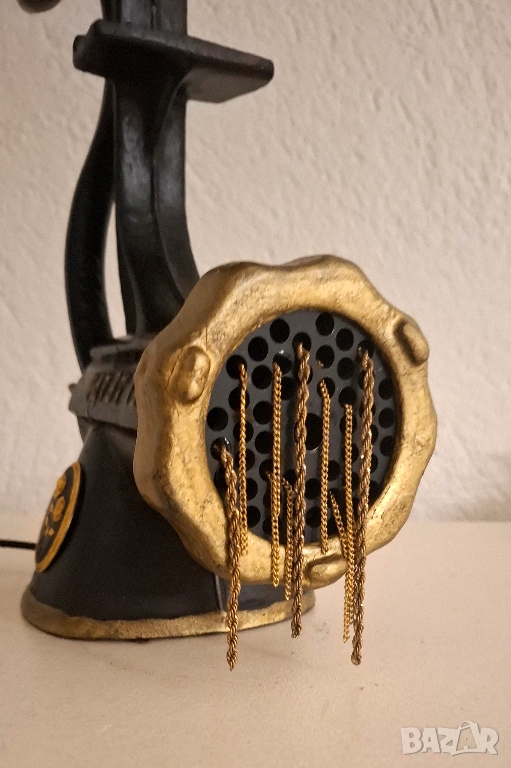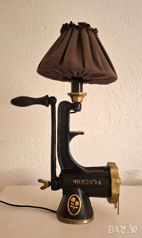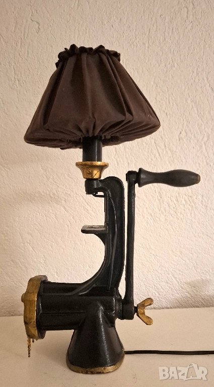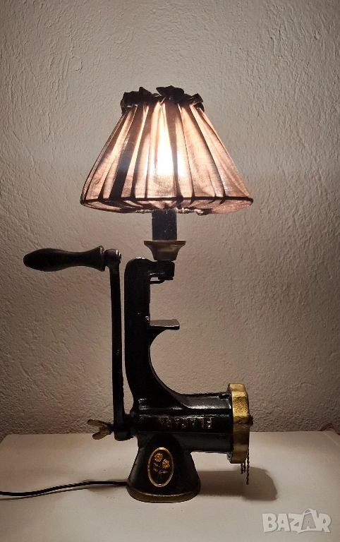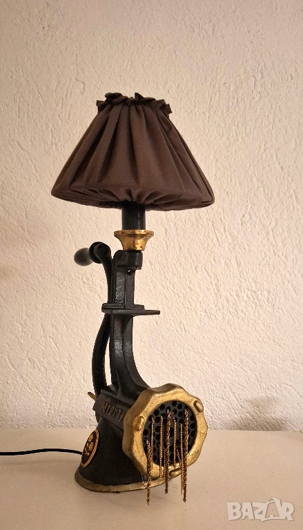 Уникална дизайнерска настолна лампа, изработена от автентична стара месомелачка. Съчетава индустриален характер, ретро чар и артистичен дух в едно впечатляващо осветително тяло.