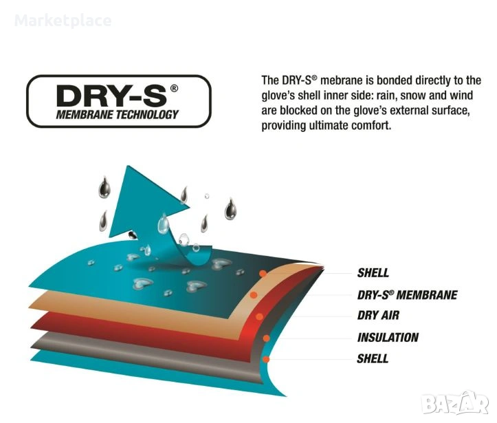 DRY‑S® мембраната е водоустойчива до 10 000 mm, ветроустойчива до 6 000 mm и дишаща.