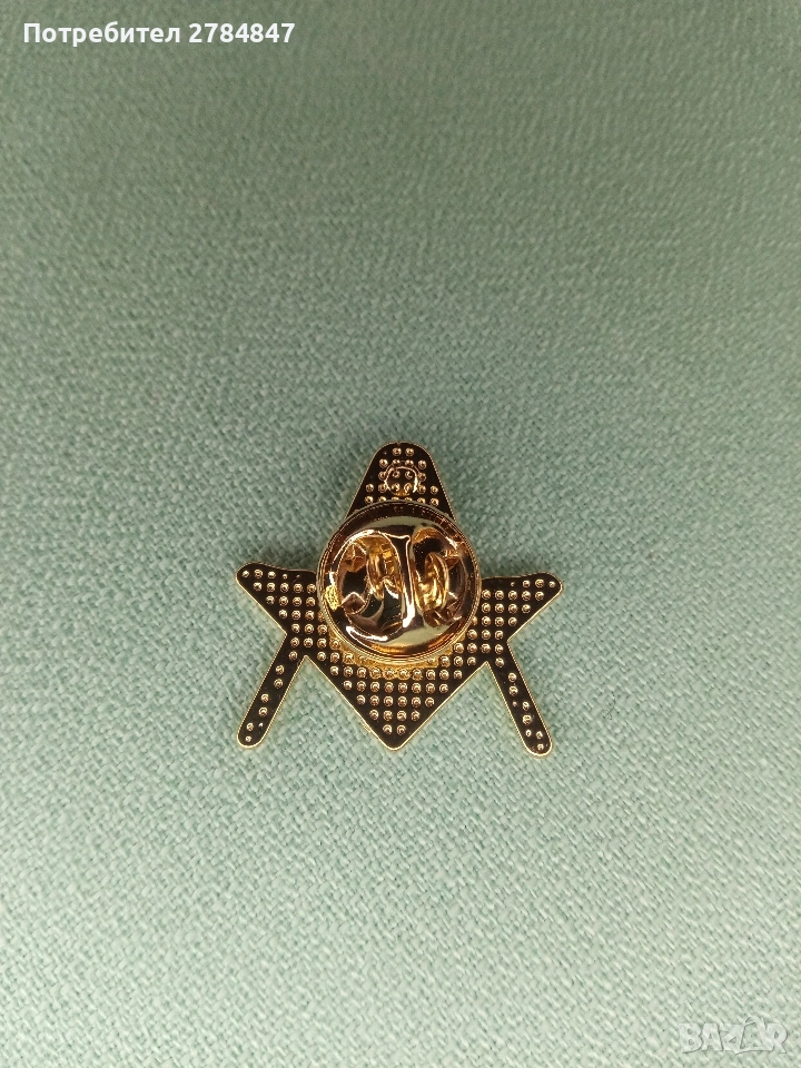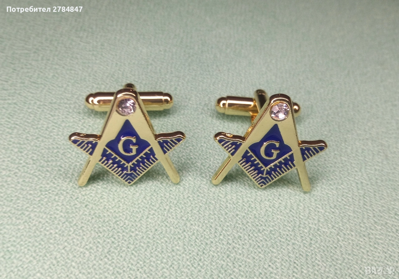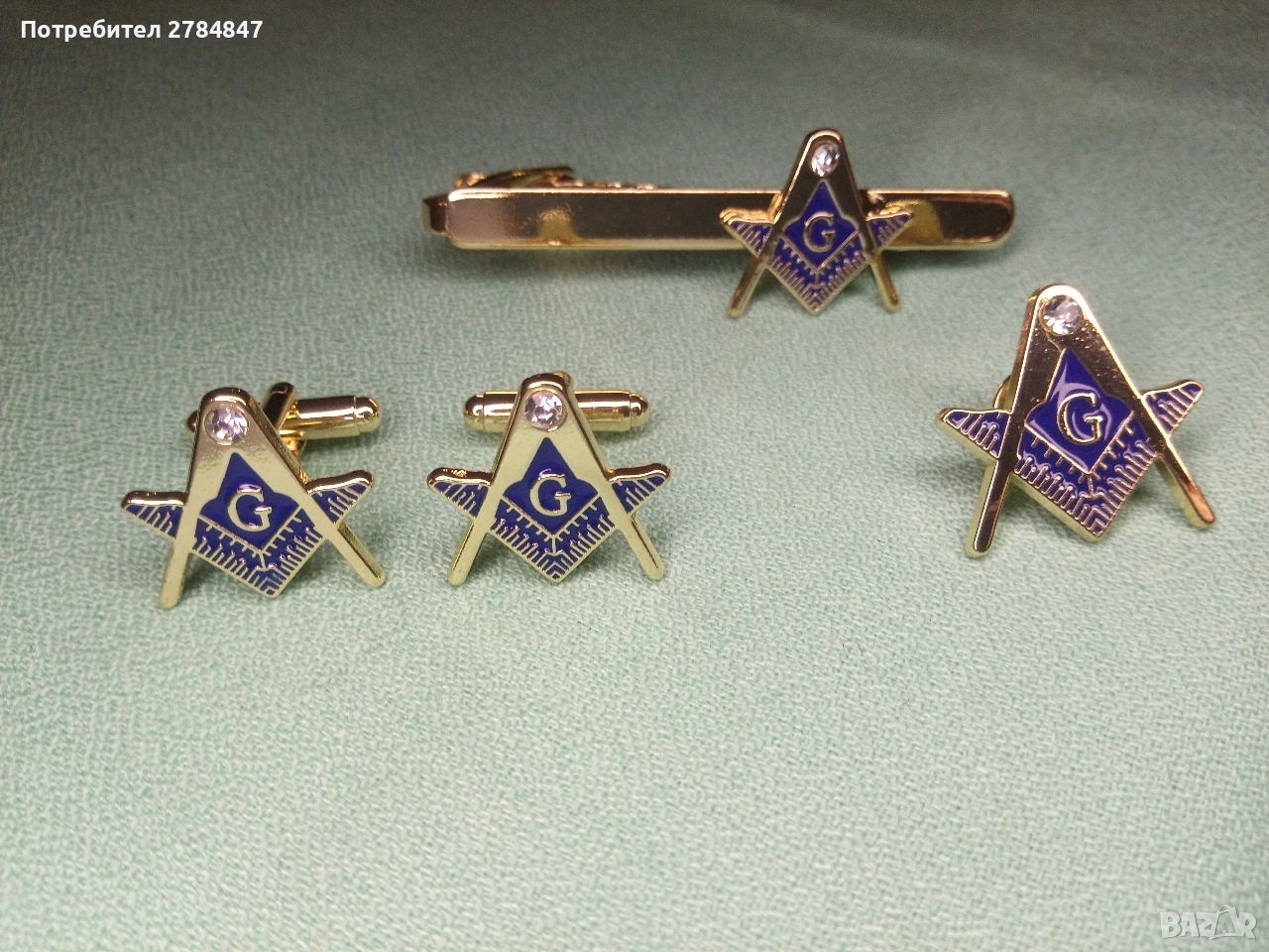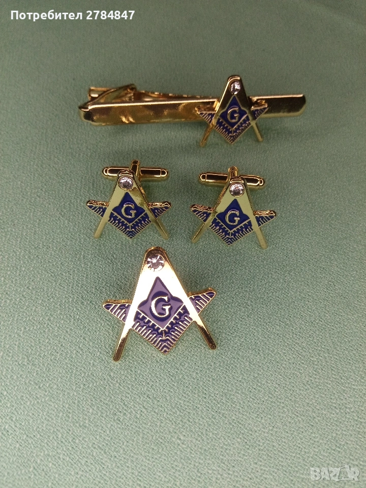 Масонски комплект. Включва игла за вратовръзка, значка и копчета за ръкавели. Размери на иглата за вратовръзка: 6,5 см на 0,5 см. Размери на значката: 2,5 см на 2,5 см. Размери на копчетата за ръкавели: 2 см на 2 см.