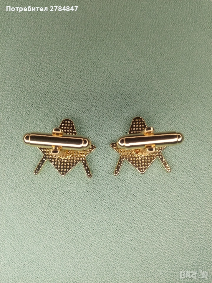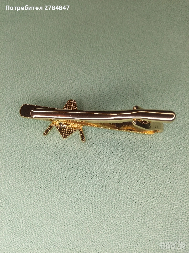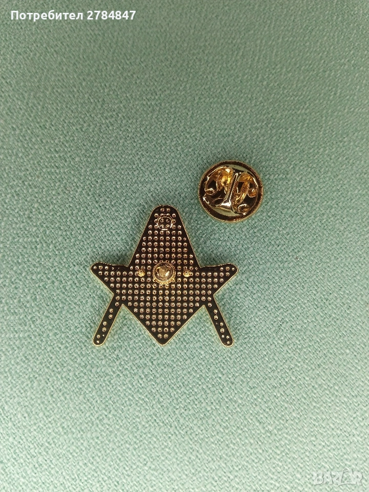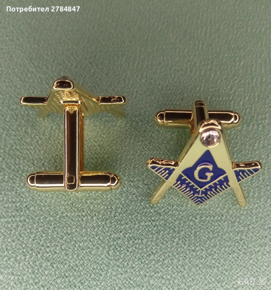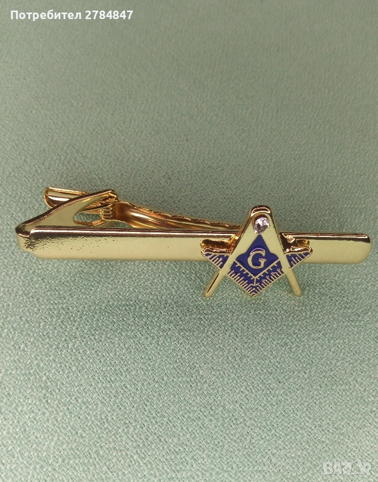 Масонски комплект. Включва игла за вратовръзка, значка и копчета за ръкавели. Размери на иглата за вратовръзка: 6,5 см на 0,5 см. Размери на значката: 2,5 см на 2,5 см. Размери на копчетата за ръкавели: 2 см на 2 см.