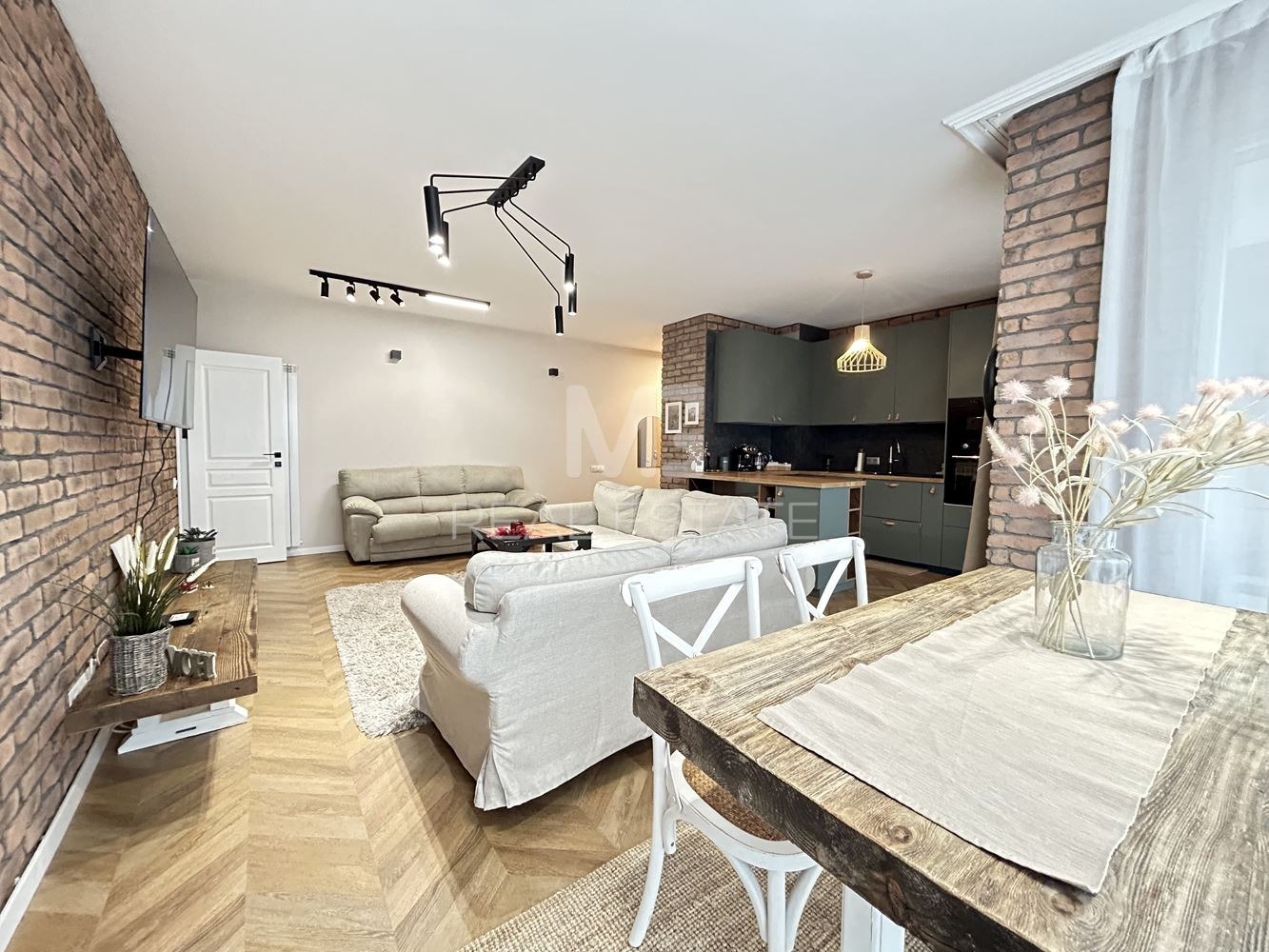 Разпределение: Антре, хол с кухненски бокс и трапезарна част, мастър спалня с дрешник и самостоятелна баня със санитарен възел, втора голяма спалня, втора баня със санитарен възел и обширна тераса.