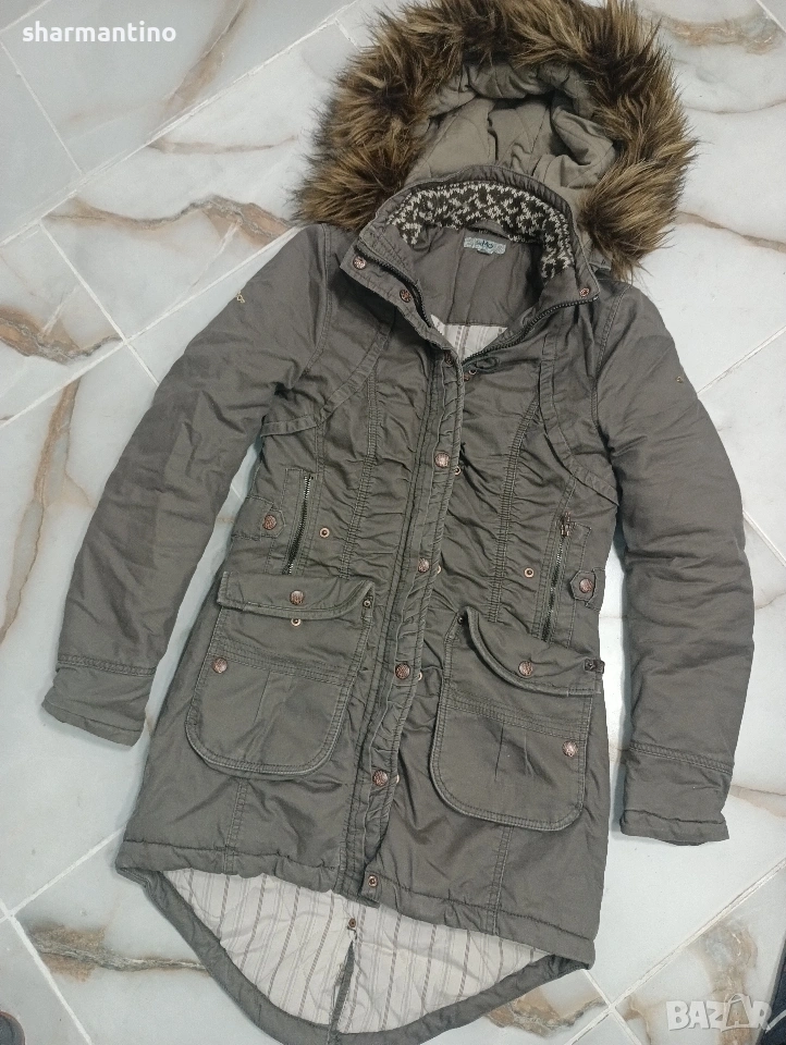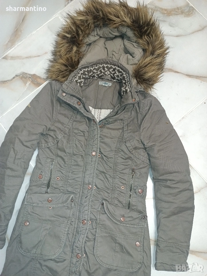 * МАРКА/МОДЕЛ- оригинално лимитирано дамско дълго яке / парка MyMo. Якето е с висока яка. С голяма сваляема пухена качулка. От 100 % Cotton. С красиви дизайн. Много джобове.